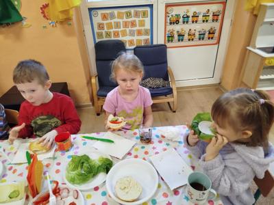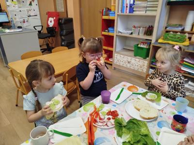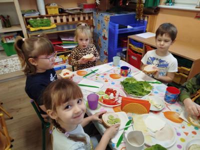 Nasze przedszkolaki miały dziś prawdziwą kulinarną przygodę! Podczas zajęć dzieci samodzielnie przygotowywały pyszne i zdrowe kanapki. Na stołach pojawiły się kolorowe warzywa: sałata, pomidory, ogórki, rzodkiewki oraz pełnoziarniste pieczywo i zdrowe dodatki.