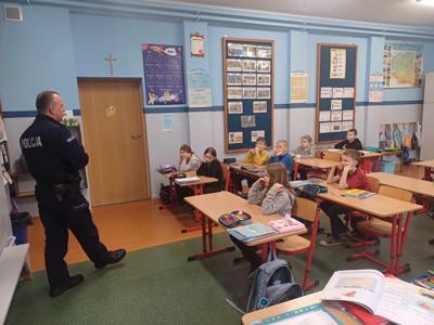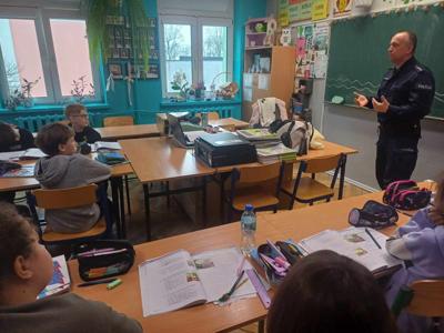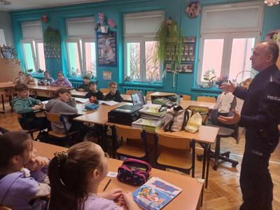 W naszej szkole odbyło się spotkanie uczniów klas młodszych oraz oddziału przedszkolnego z dzielnicowym. Tematem prelekcji było bezpieczeństwo na drodze oraz podczas zbliżających się ferii zimowych.
