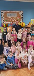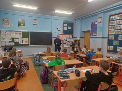 Policjant przypomniał zasady bezpiecznego przechodzenia przez jezdnię, znaczenie noszenia elementów odblaskowych oraz odpowiedniego zachowania w pobliżu dróg. Podkreślił również, jak ważna jest rozwaga podczas zimowych zabaw, takich jak jazda na sankach czy zabawy na lodzie.