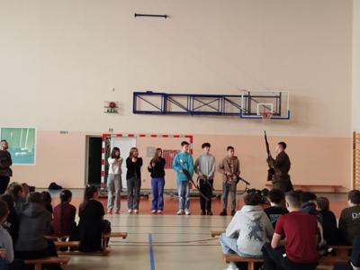 Podczas tego wydarzenia uczniowie mieli okazję poznać realia życia i walki powstańców warszawskich. Zaprezentowano bezpieczne repliki sprzętu bojowego, elementy umundurowania oraz inne eksponaty związane z okresem II wojny światowej. Dodatkowo organizatorzy przygotowali ciekawe inscenizacje, w których młodzież mogła aktywnie uczestniczyć. Wydarzenie spotkało się z dużym zainteresowaniem uczniów, którzy zadawali pytania i chętnie angażowali się w przygotowane atrakcje. Była to nie tylko lekcja historii, ale również ważna okazja do refleksji nad patriotyzmem i trudami walki z okupantem. Wszystkim uczestnikom oraz organizatorom dziękujemy za niezapomniane przeżycia i cenną lekcję historii.