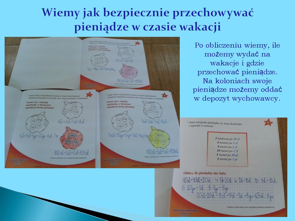 W naszej szkole zakończył się właśnie ogólnopolski projekt wdrażany przez Fundację Młodzieżowej Przedsiębiorczości i Fundację PZU pn. „Bezpieczne wędrówki od grosika do złotówki". Projekt realizowany był w klasie II, przez panią Lillę Dawid. Jego celem było poszerzanie wiedzy w zakresie edukacji finansowej, nabywanie doświadczenia dotyczącego samodzielnego podejmowania decyzji związanej z gospodarowaniem własnymi oszczędnościami, poznawanie sposobów racjonalnego gospodarowania oraz rozwijanie umiejętności w zakresie bezpieczeństwa uczniów. Nasi uczniowie bardzo aktywnie uczestniczyli w zajęciach, a efekty ich pracy można obejrzeć w załączonej prezentacji.
