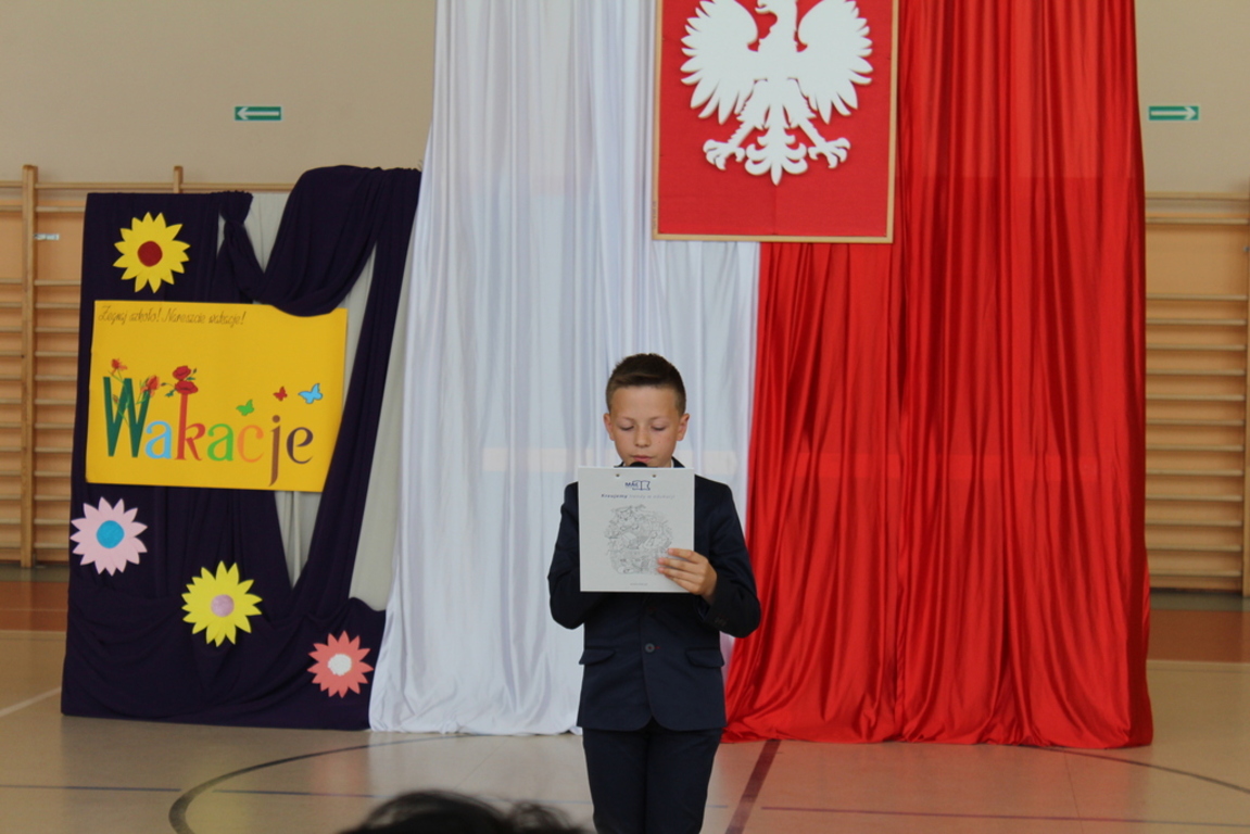 26 czerwca 2015 roku odbyło się uroczyste zakończenie roku szkolnego 2014/2015.Wszyscy uczniowie długo czekali na chwilę, gdy po raz ostatni w tym roku szkolnym zabrzmi dzwonek, który oznajmi początek wakacji.Uroczyste zakończenie roku to dla każdego ucznia chwila niezwykle radosna, niosąca za sobą trud dziesięciu miesięcy nauki, a dla szóstoklasistów podsumowanie kilku lat nauki w naszej szkole.Apel rozpoczął się od wyprowadzenia sztandaru szkoły oraz odśpiewania hymnu. Następnie nastąpiło uroczyste przekazanie sztandaru przedstawicielom klas V. Nowy Poczet Sztandarowy tworzą: Ciepłuch Gabriela, Kolba Anna i Krakowski Mateusz. Następnie głos zabrał pan dyrektor Marek Guć i powitał zaproszonych gości. W swym wystąpieniu pogratulował uczniom wytrwałości oraz wspaniałych wyników; podziękował wszystkim za cały rok pracy - uczniom, rodzicom, nauczycielom oraz pracownikom szkoły.Szóstoklasiści uroczyście wypowiedzieli słowa przysięgi. Przyrzekali rozsławiać pracą i nauką dobre imię Szkoły Podstawowej w Wojsławicach.