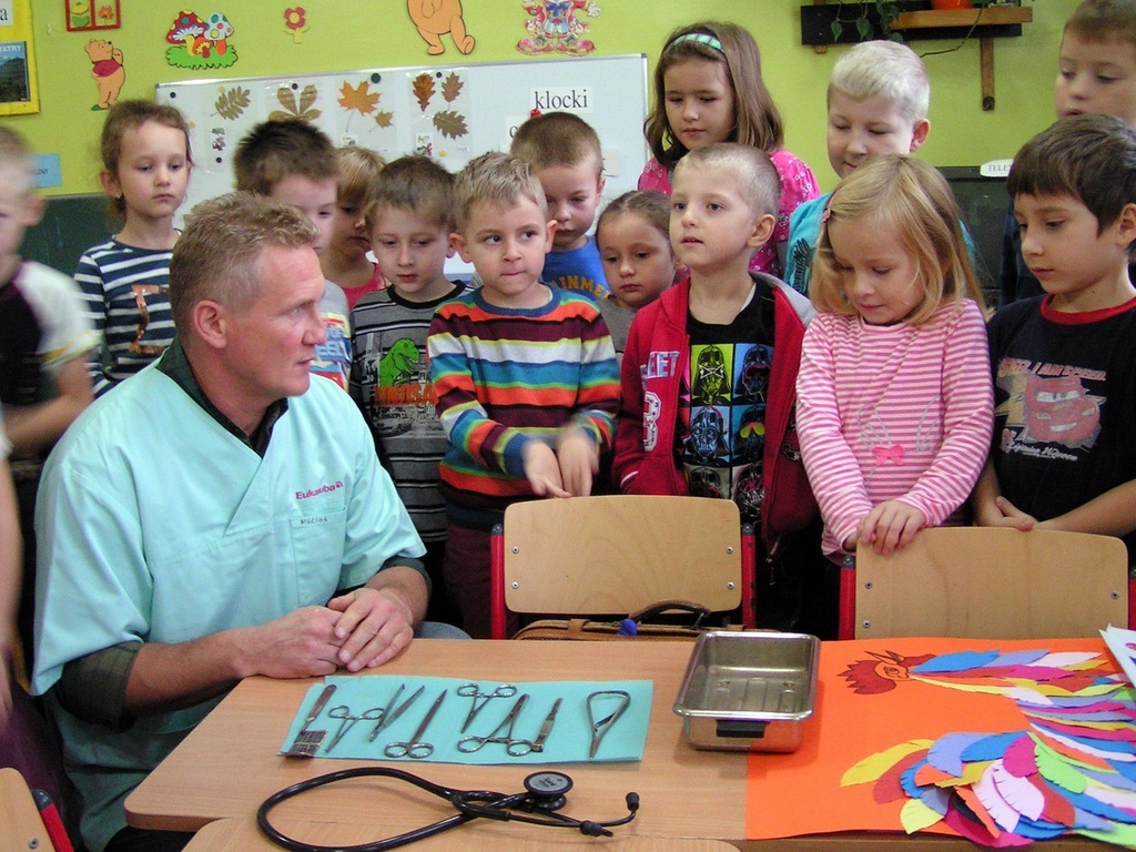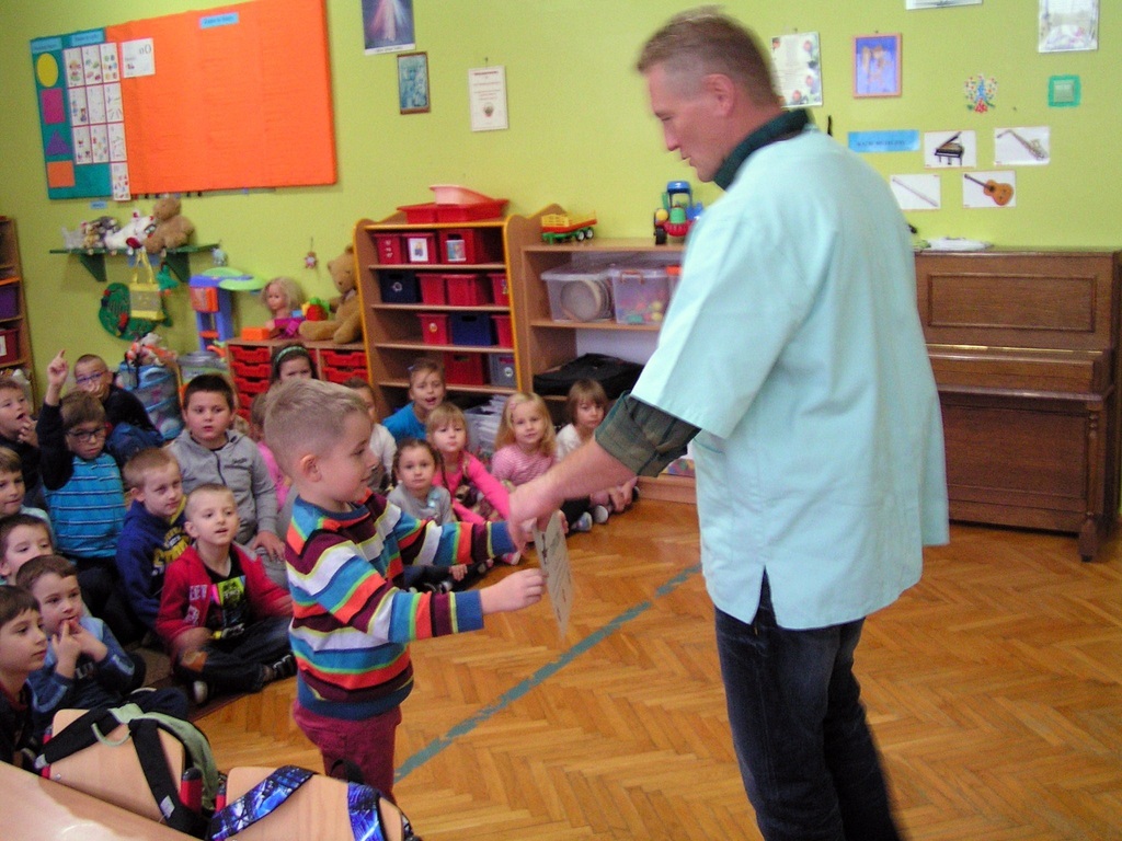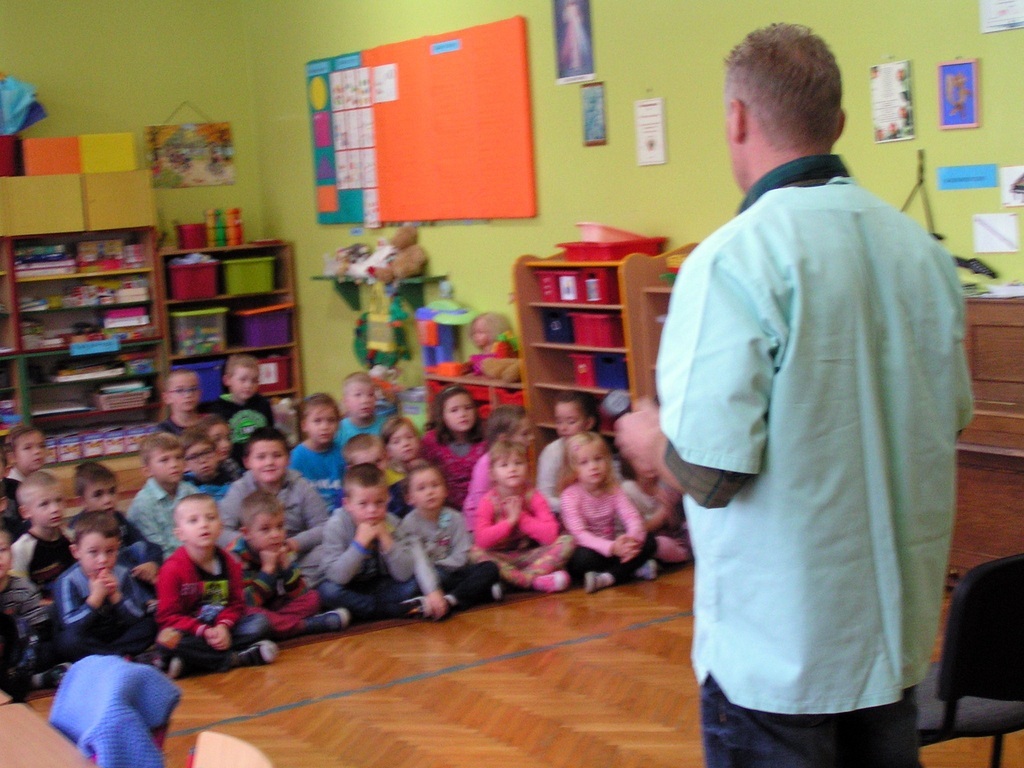 W ramach poznawania ciekawych zawodów, zaprosiliśmy do naszej szkoły pana Krzysztofa Maciosa, który jest lekarzem weterynarii. Pan Krzysztof opowiedział dzieciom jak należy opiekować się zwierzętami, jak przeprowadza się zabiegi, pokazał narzędzie służące do operacji. Dzieci słuchały z wielkim zaciekawieniem i zadawały mnóstwo pytań. Pan Krzysztof cierpliwie i wyczerpująco odpowiadał na wszystkie pytania dzieci. Mówił również o tym jak trzeba się zachować podczas ataku psa i czego nie wolno robić w kontakcie ze zwierzęciem.