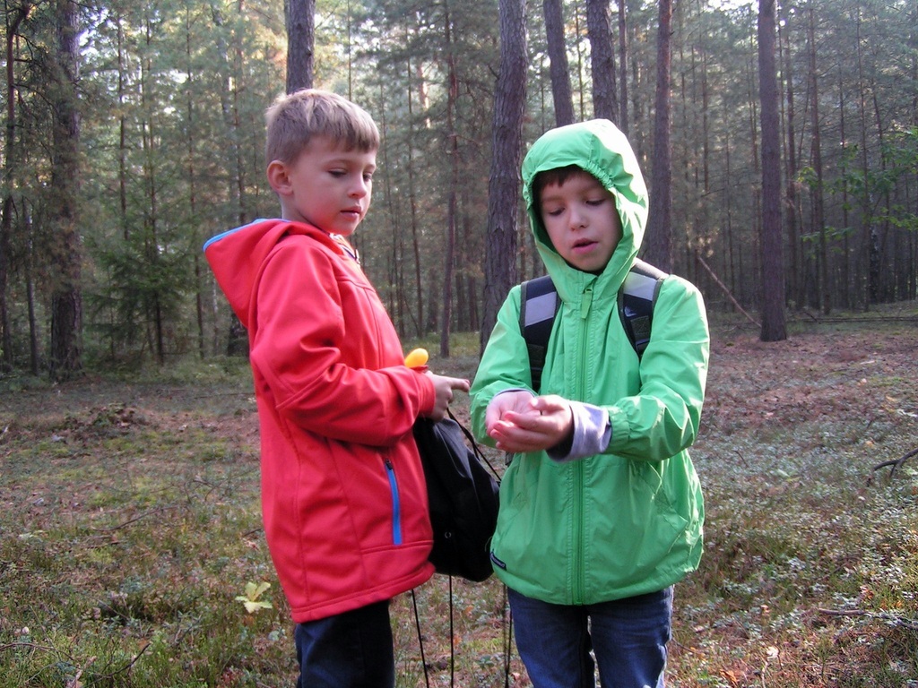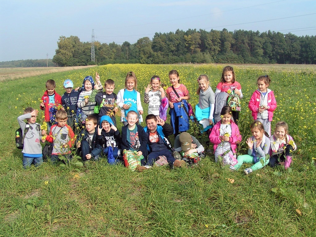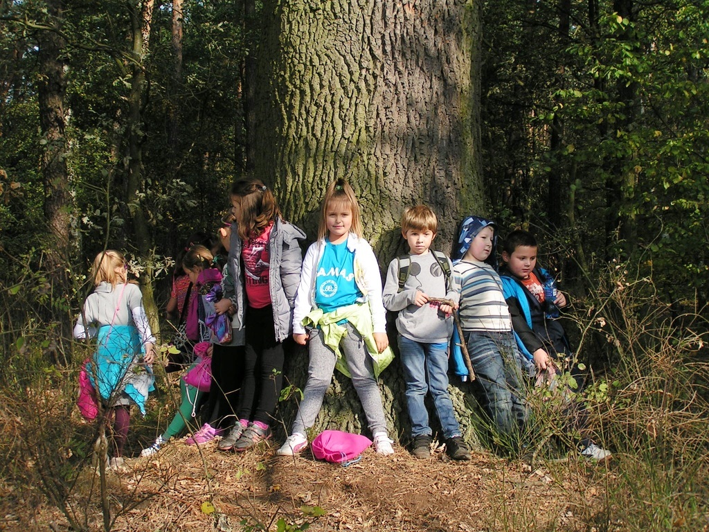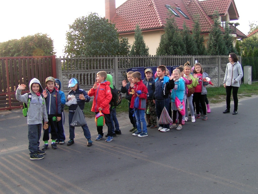 Uczniowie klasy IIb wyruszyli na poszukiwanie jesieni do pobliskiego lasu. Wyposażeni w lupy i szkła powiększające szukali oznak tej przepięknej pory roku. W lesie napotkali ogromne mrowisko, żabę i żuka. Spróbowali zmierzyć obwód najstarszego i najgrubszego drzewa, które nazwali dąb Eustachy. Niektórym szczęśliwcom trafiło się znaleźć podgrzybki i prawdziwki. Po trudach poszukiwań dzieci zjadły drugie śniadanie na leśnej polanie, pamiętając również o posprzątaniu . W drodze powrotnej uczniowie zbierali kwiaty i skarby jesieni. Zmęczeni ale szczęśliwi wrócili do szkoły.