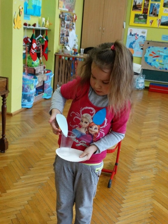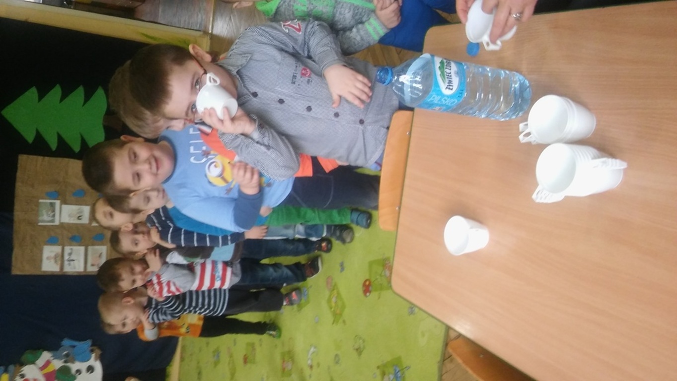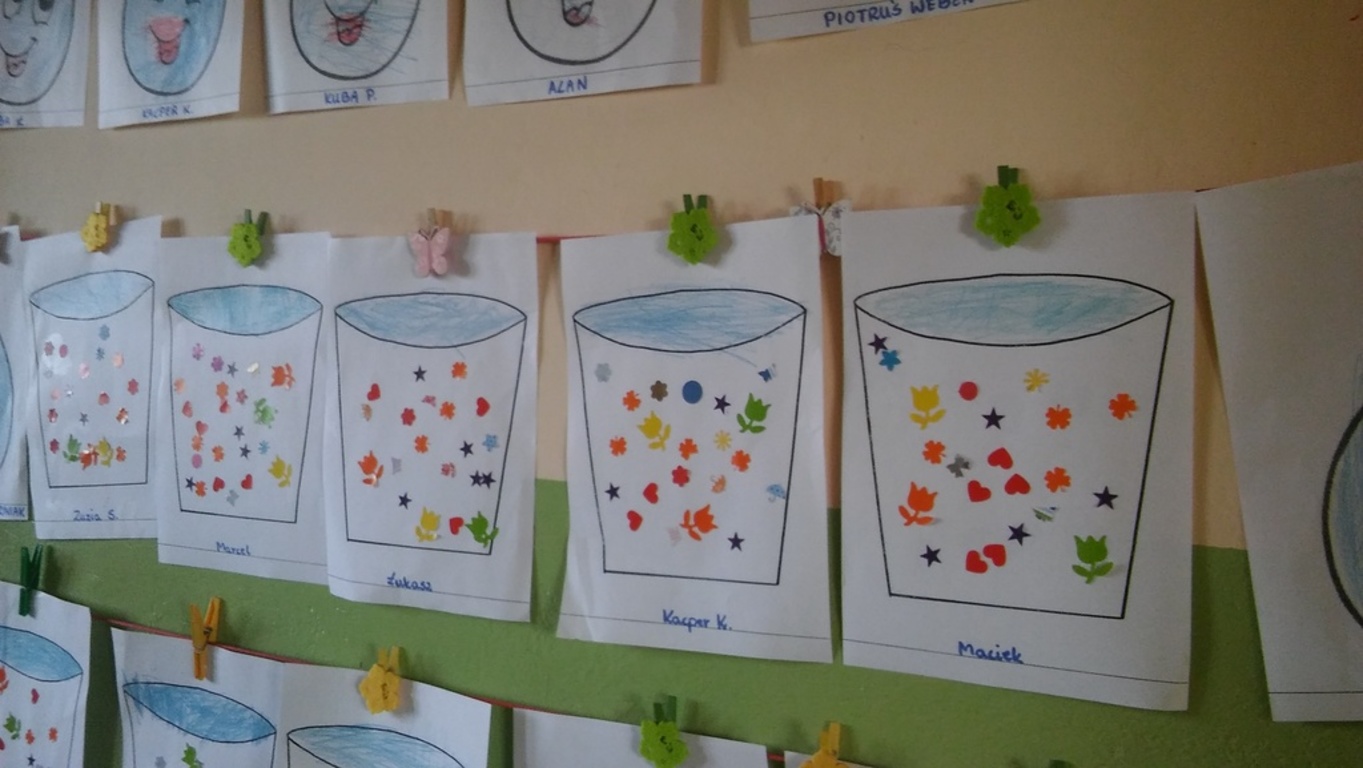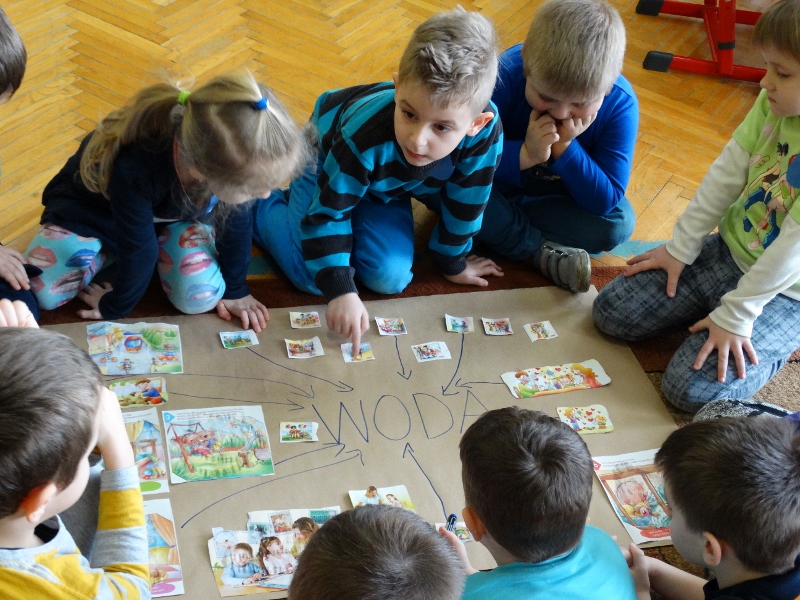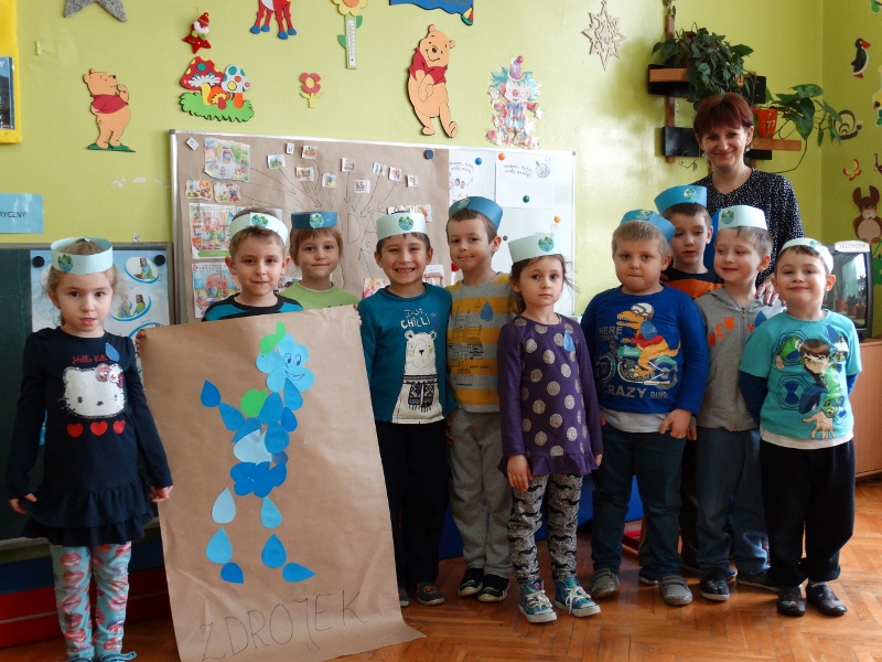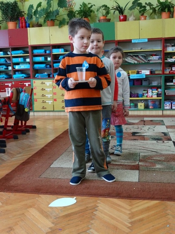 „Jak woda przydaje się mojej rodzinie” – podczas zajęcia dzieci zostały zapoznane z zastosowaniem wody w domu (do jedzenia, do higieny osobistej, zachowania czystości w domu, dla roślin). Wprowadzony został podział wody na wodę pitną i nieodpowiednią do picia. Na koniec zajęcia odbyło się puszczanie baniek mydlanych.