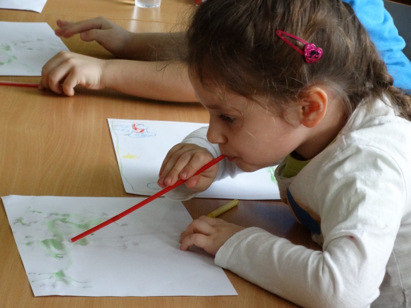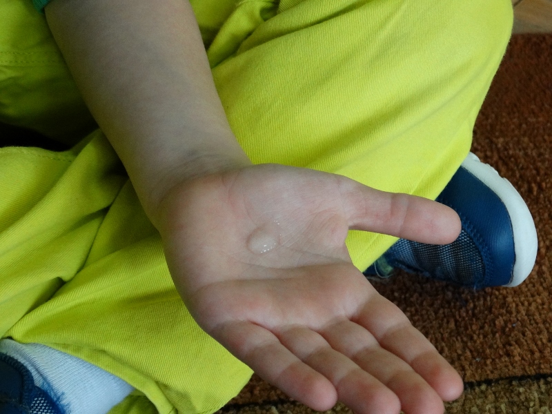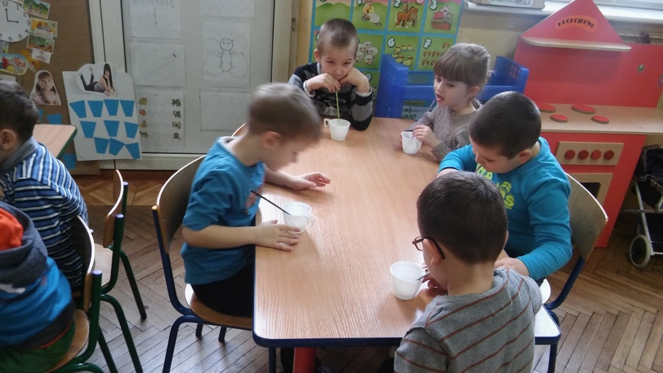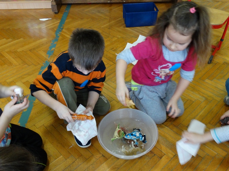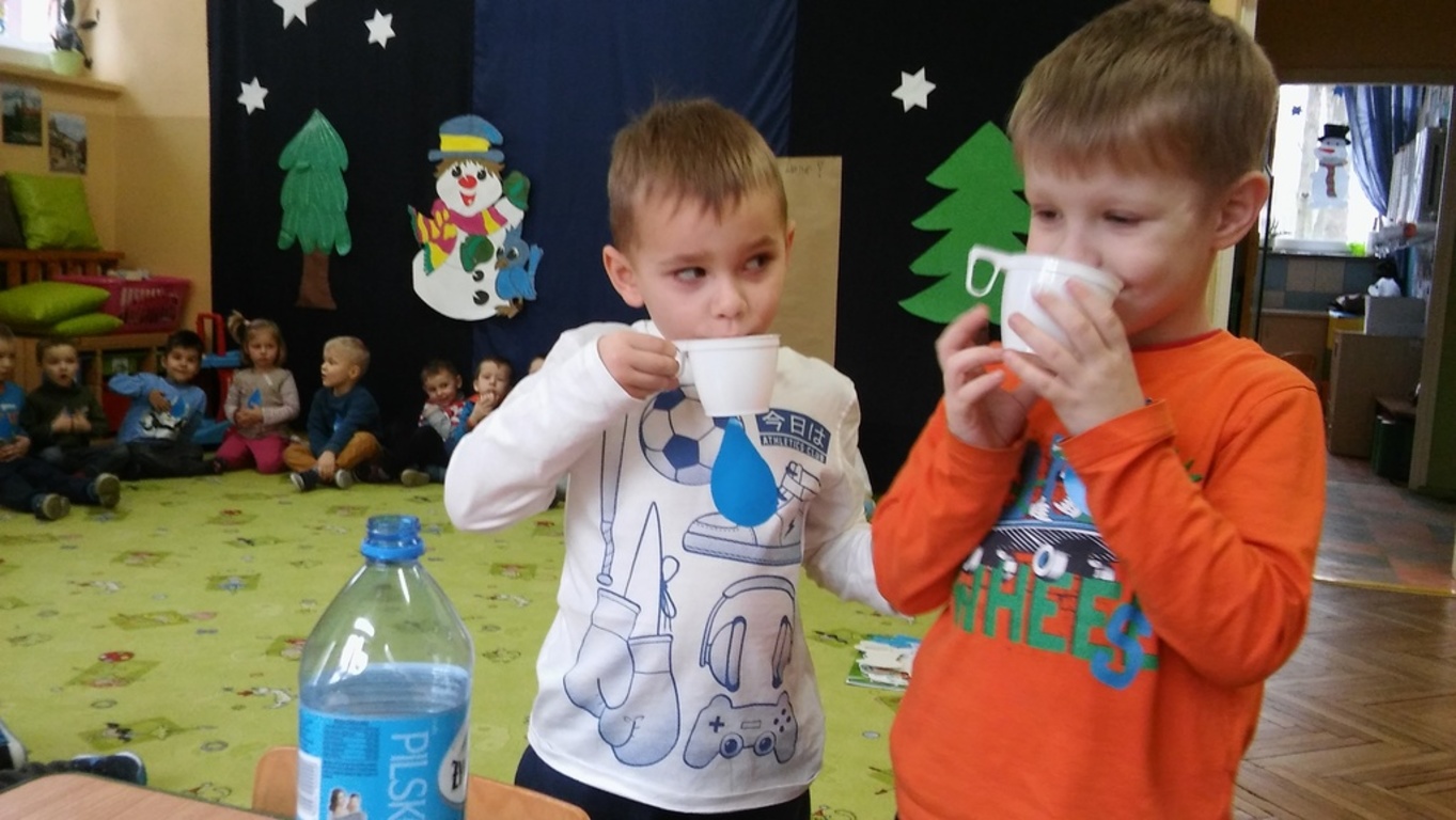 „Jak woda przydaje się mojej rodzinie” – podczas zajęcia dzieci zostały zapoznane z zastosowaniem wody w domu (do jedzenia, do higieny osobistej, zachowania czystości w domu, dla roślin). Wprowadzony został podział wody na wodę pitną i nieodpowiednią do picia. Na koniec zajęcia odbyło się puszczanie baniek mydlanych.
