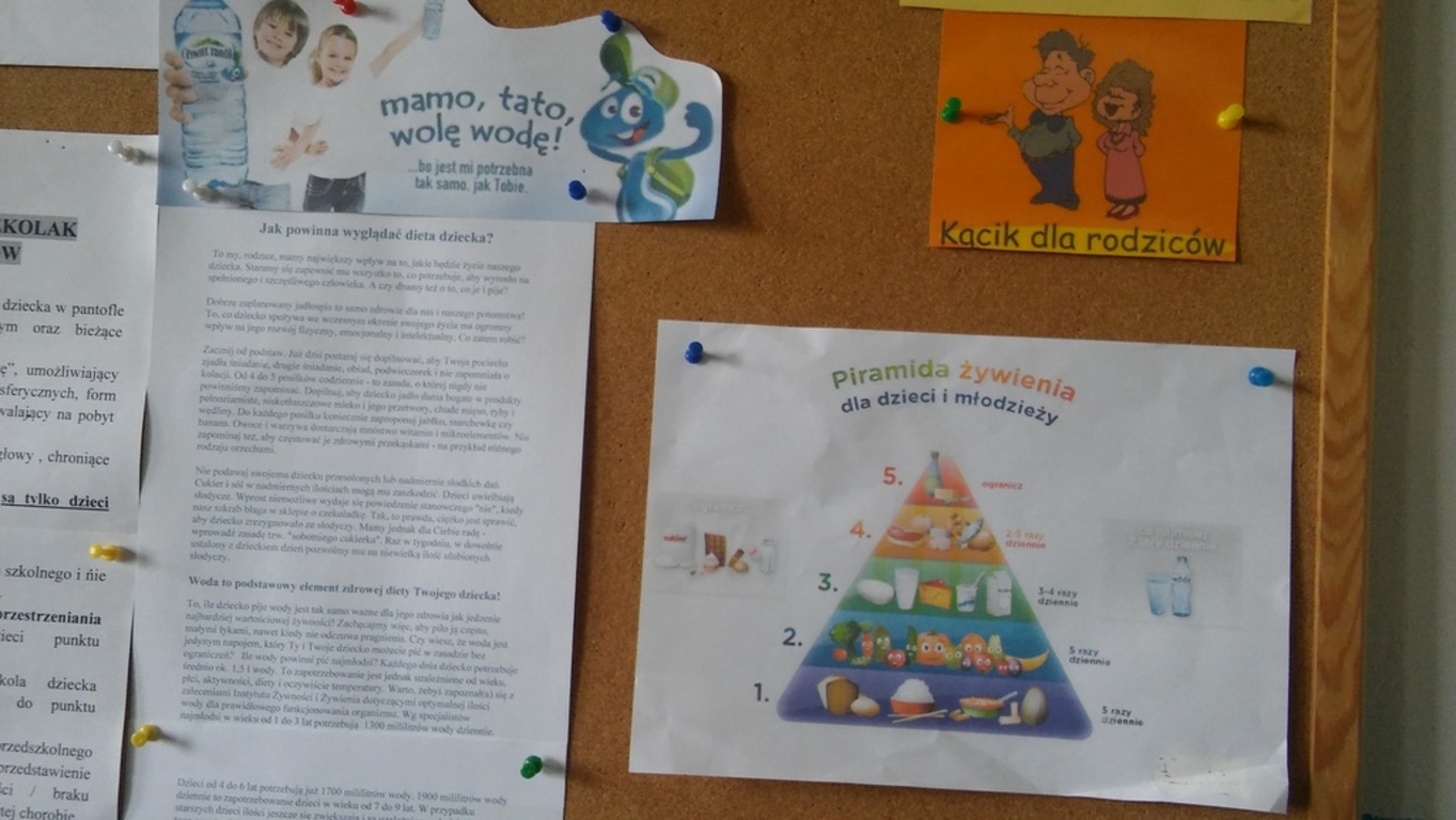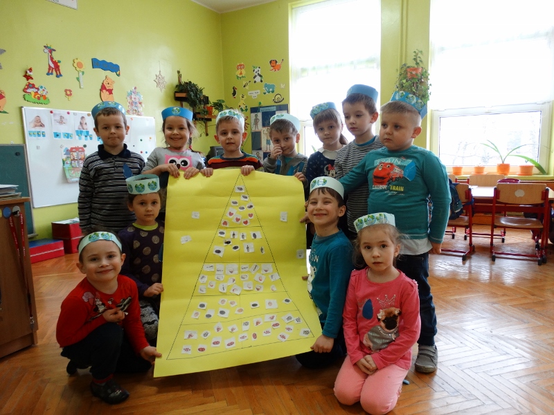 „Mój wodny portret” – na tym zajęciu dzieci poznały zasady zdrowego odżywiania się, jak również zostały zapoznane ze znaczeniem spożywania regularnych pięciu posiłków dla prawidłowego funkcjonowania organizmu. Została opracowana PIRAMIDA ŻYWIENIA.