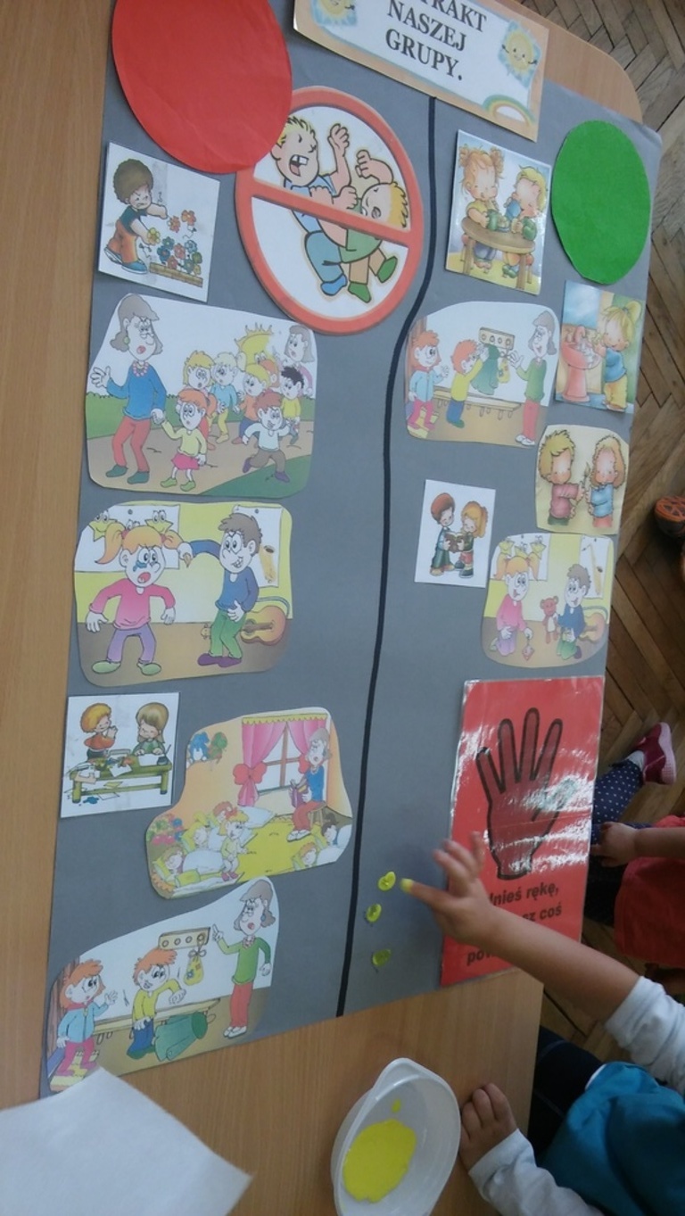 Początek roku szkolnego dla Naszych maluchów jest bardzo trudny, gdyż muszą nauczyć się współdziałania w grupie, zasad bezpieczeństwa i norm panujących w przedszkolu. Aby dzieciom ułatwić poznawanie i przyswajanie zasad prowadzimy zajęcia adaptacyjne, integracyjne, zabawy parateatralne z zakresu bezpieczeństwa i ustalamy nasz wspólny wewnętrzny kodeks przedszkolaka pod którym każdy maluch musi przypieczętować podpis paluszkiem. Podpisany kodeks wiszący na ścianie naszego przedszkola zobowiązuje „Krasnoludki” do przestrzegania norm panujących w naszej grupie.