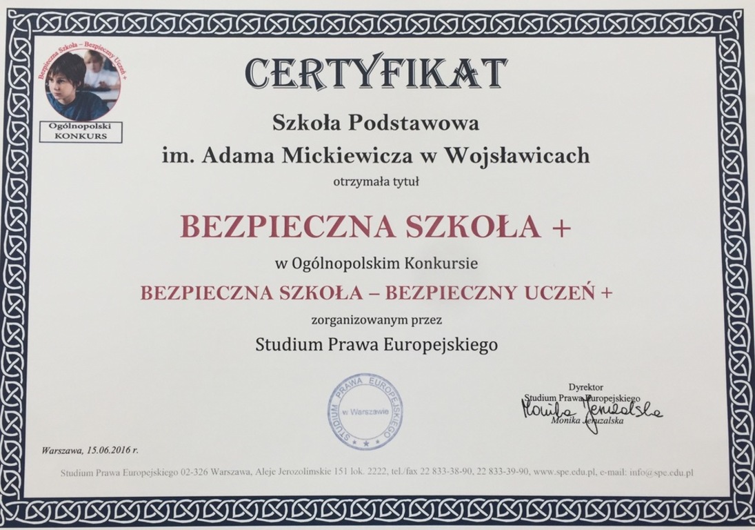 W bieżącym roku szkolnym nasza placówka przystąpiła do programu "Bezpieczna Szkoła – Bezpieczny Uczeń +. Realizowaliśmy w związku z tym szereg zadań wynikających z programu. Ostatecznie nasza praca przyniosła efekty w postaci uzyskanego certyfikatu. dziękujemy wszystkim, którzy przyczynili się do jego uzyskania.