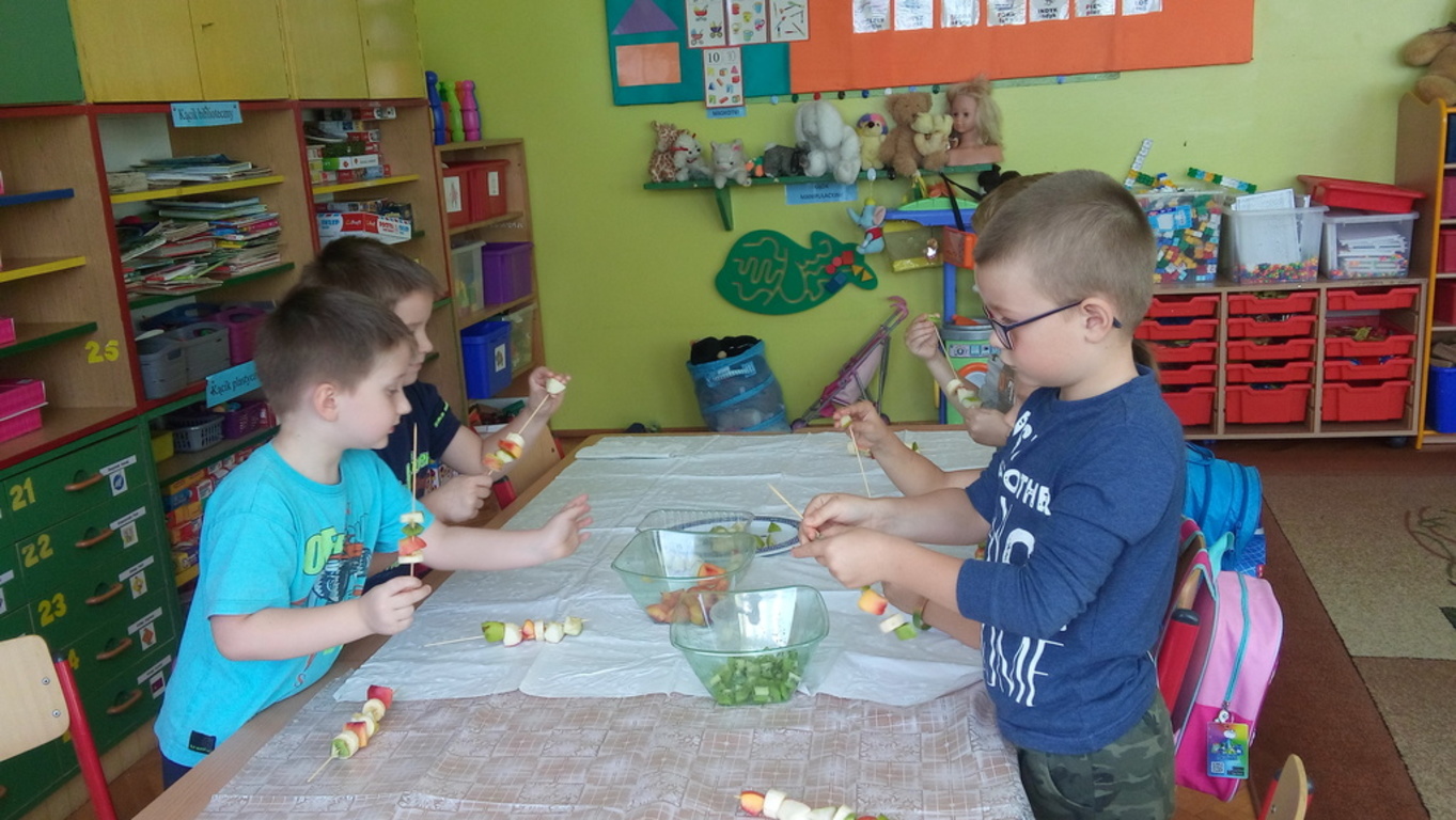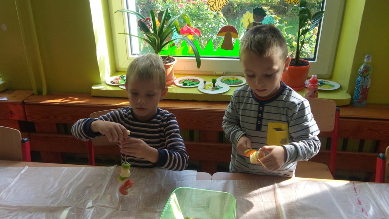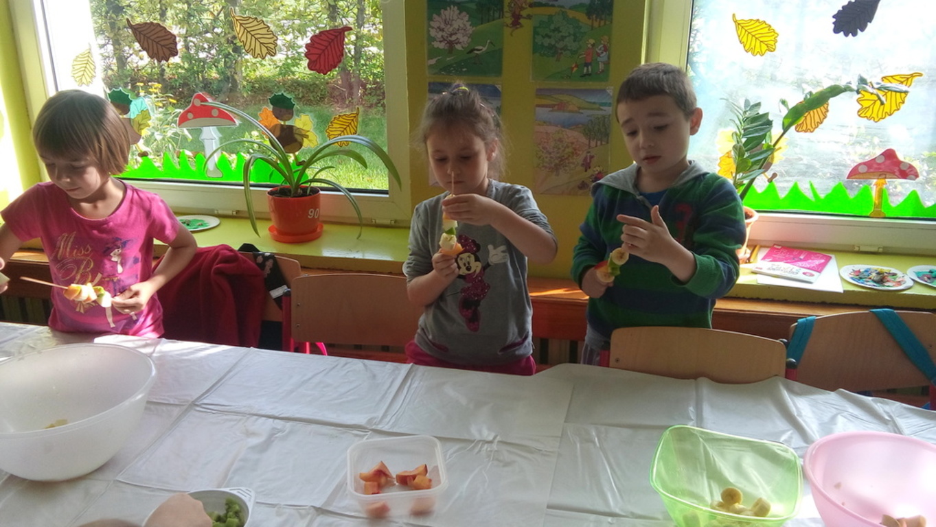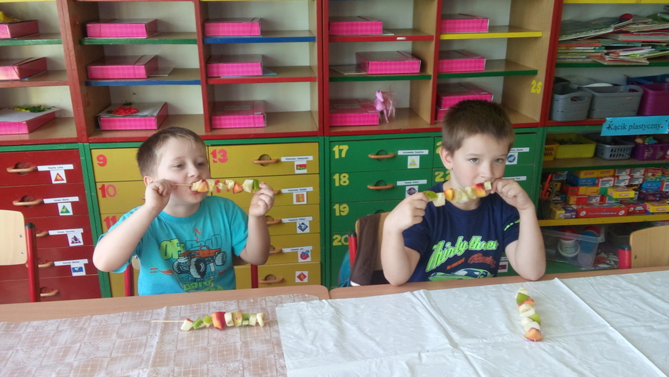 Na początku miesiąca klasa”0” poznawała owoce, nazwy, smaki i kolory. Na podsumowanie tygodnia owoców przygotowała „owocowe szaszłyki”. Dzieci nadziewały na patyczki kawałki owoców według własnego pomysłu. Po wykonaniu „owocowego szaszłyka” każde dziecko mogło go zjeść. Poprzez zabawę dzieci poznawały nowe smaki i uczyły się pokonywać bariery w jedzeniu owoców. Dowiedziały się również o ważności jedzenia owoców jako źródła witamin potrzebnych dla naszego zdrowia.