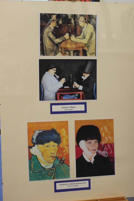Projekt przebiegał w kilku etapach. Pierwszy to przeglądanie albumów, oglądanie filmów edukacyjnych o konkretnych dziełach i malarzach jednocześnie przybliżając ich życie i twórczość. Kolejnym etapem była próba namalowania kopii dowolnego dzieła . Powstałe prace zawisły na szkolnym korytarzu jako pierwsza wystawa. Następny etap, wywołał w uczniach a także ich rodzicach dużo radości, było wcielanie się w role postaci ze słynnych obrazów. Efekty pracy nad projektem można oglądać w formie wystawy na korytarzach Urzędu Gminy Zduńska Wola. Serdecznie zapraszamy.