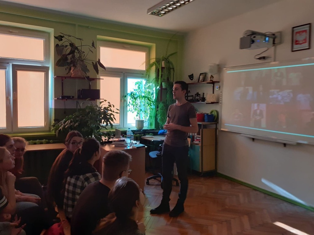 5 grudnia do naszej szkoły zawitał pan Tomasz Sobania, najmłodszy w Polsce autor powieści z gatunku fantasy, zapalony sportowiec, biegacz klubu „Piast” Gliwice i niezwykle sympatyczny człowiek. Spotkanie to było kontynuacją projektu w „Znajdź pomysł na siebie”, w którym nasza młodzież brała udział. Pierwszą część spotkania nasz gość poświęcił na opowieść o tym, jak będąc uczniem jednego z gliwickich liceum, stał się autorem książki. Pokazał swą determinację, gdy udało mu się zebrać fundusze na wydanie powieści „Speculo” dzięki portalowi „Polak potrafi”, opowiadał także na pytania słuchaczy. Podczas drugiej części starał się zarazić nas optymizmem, pokazując swe pasje- przede wszystkim bieganie na długie dystanse, przełamywanie strachu- skoki ze spadochronem. Opowiedział także o kolejnych planach pisarskich, biegu do hiszpańskiego sanktuarium Santiago de Compostella a także udziale w „Rejsie Niepodległości”, na pokładzie żaglowca „Dar Młodzieży”. Pochwalił się spotkaniem z red. Maciejem Orłosiem czy Robertem Lewandowskim, którzy skierowali do niego wiele ciepłych słów uznania.