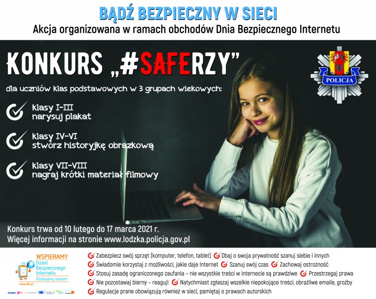 - „#SAFErzy” - konkurs plastyczno-filmowy. Zapoznaj się z regulaminem i rozwijaj swoją kreatywność. Startujemy 10 lutego! Szczegóły tutaj: Konkurs "#SAFErzy" - Informacje - Policja Łódzka