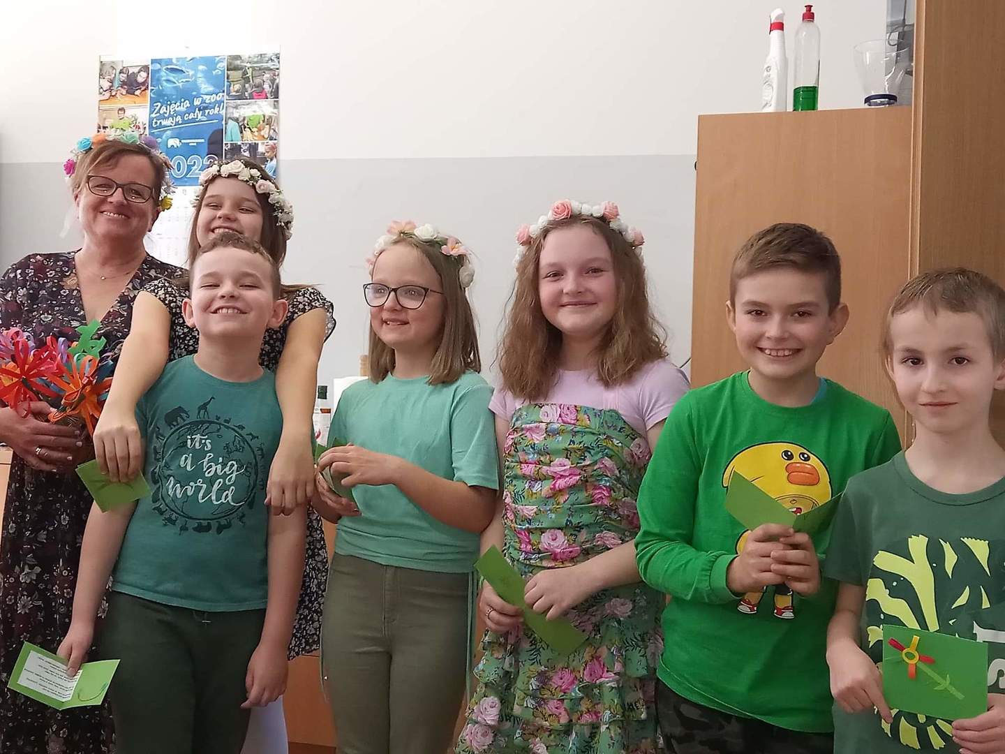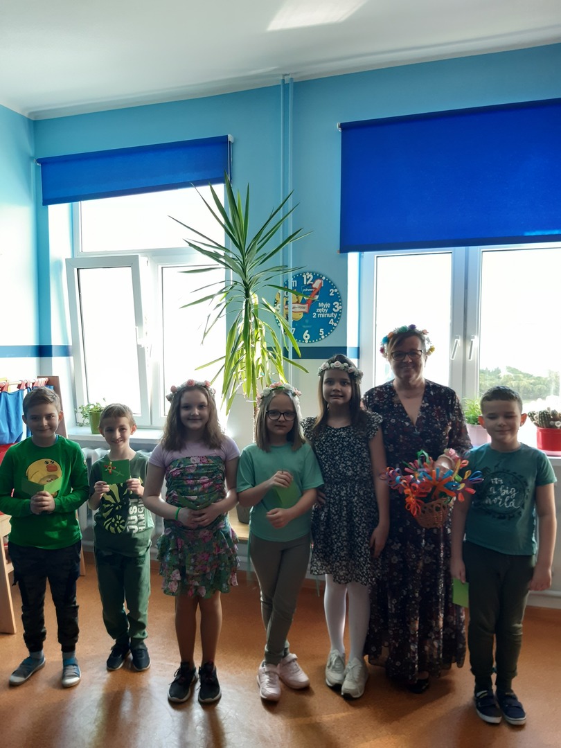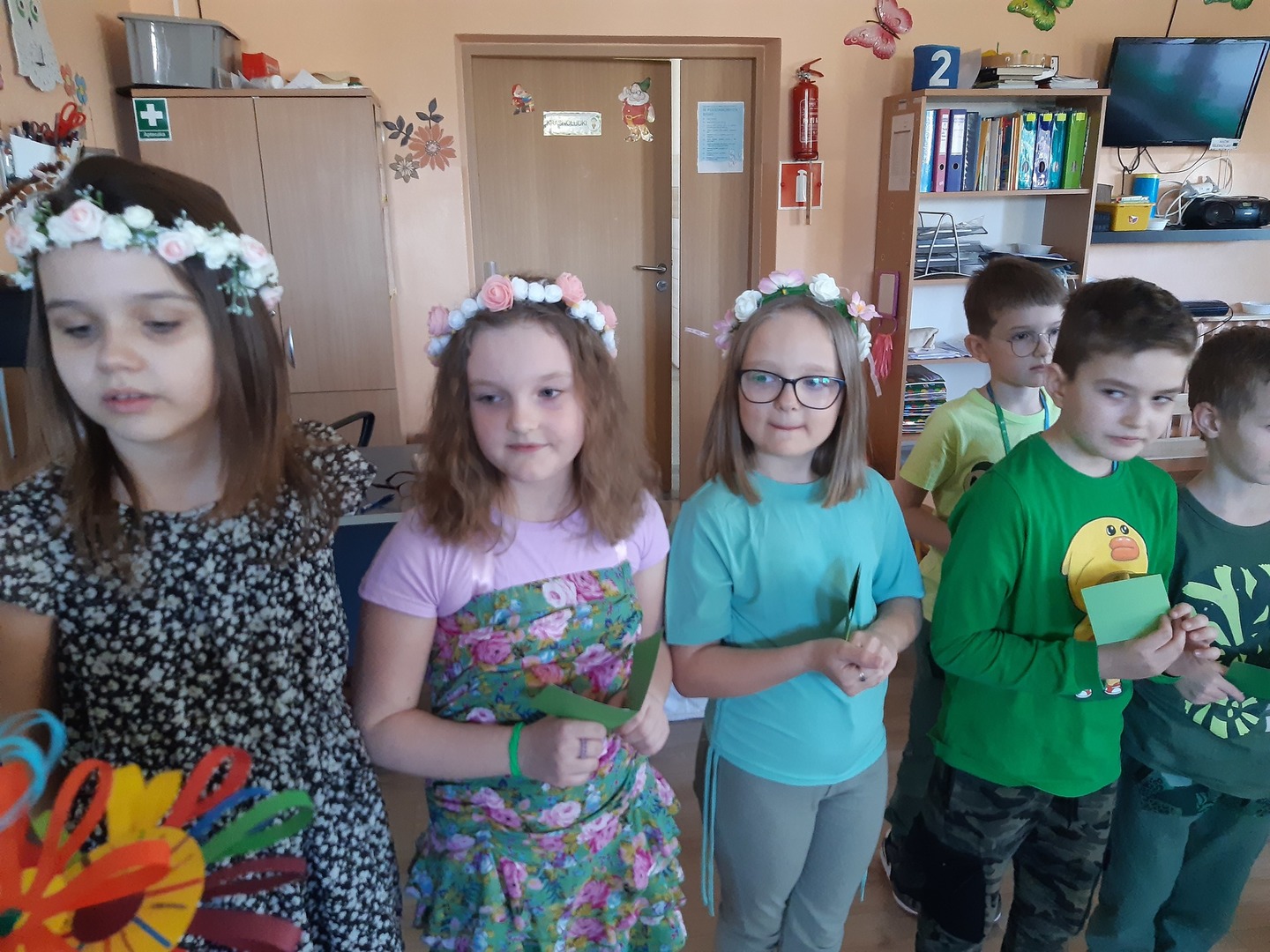 Wiosna to czas, kiedy przyroda budzi się do życia po długim, zimowym śnie. Jak co roku uczniowie naszej szkoły pożegnali zimę i radośnie powitali wiosnę. Organizatorami radosnego powitania wiosny była kl. II wraz z wychowawczynią. Tego dnia nauczyciele i każde dziecko w szkole miało zielony strój z elementem symbolizującym wiosnę. Klasa II odwiedzała wszystkie klasy z wiosennymi zagadkami i wiosennymi kwiatkami. Każda klasa miała za zadanie odpowiadać na wcześniej przygotowane zagadki. W nagrodę za odgadnięcie zagadek drugoklasiści wręczali nauczycielom papierowe kwiatki własnoręcznie wykonane. Wszyscy bardzo dobrze się bawili.