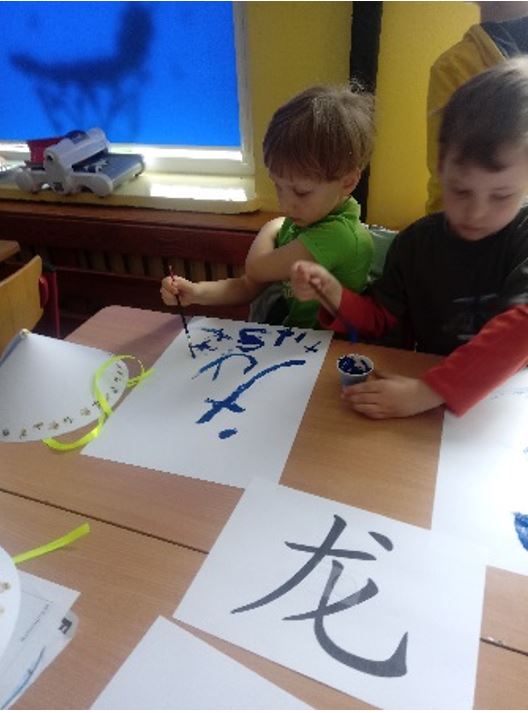 W marcu poznaliśmy kolejny kontynent – Azję. Jako pierwszy kraj azjatycki odwiedziliśmy Chiny. Poznaliśmy najważniejsze chińskie wynalazki, takie jak: papier, proch , pismo. Spróbowaliśmy pisać chińskie znaki i wykonaliśmy chińskie smoki