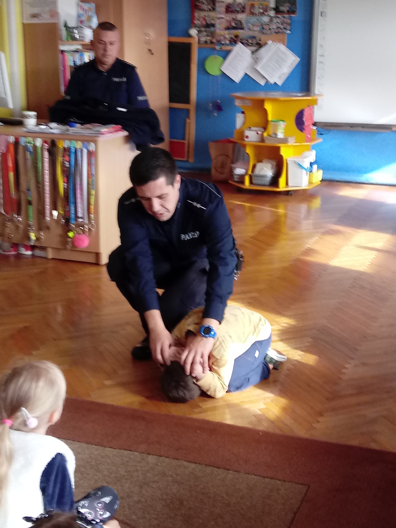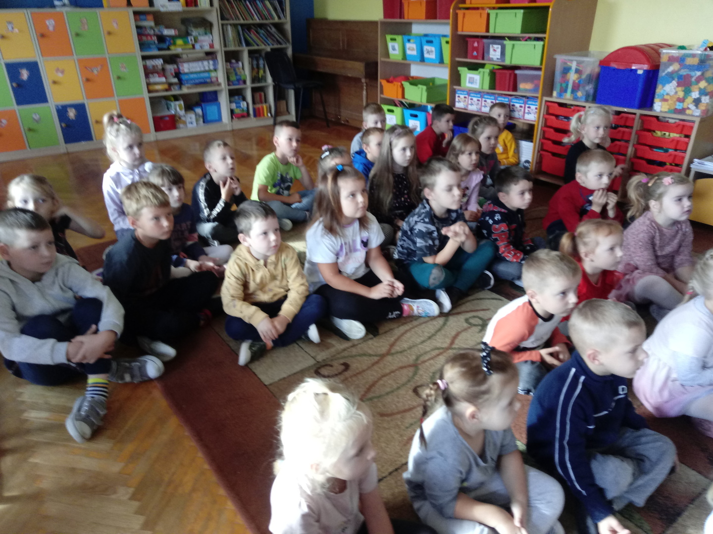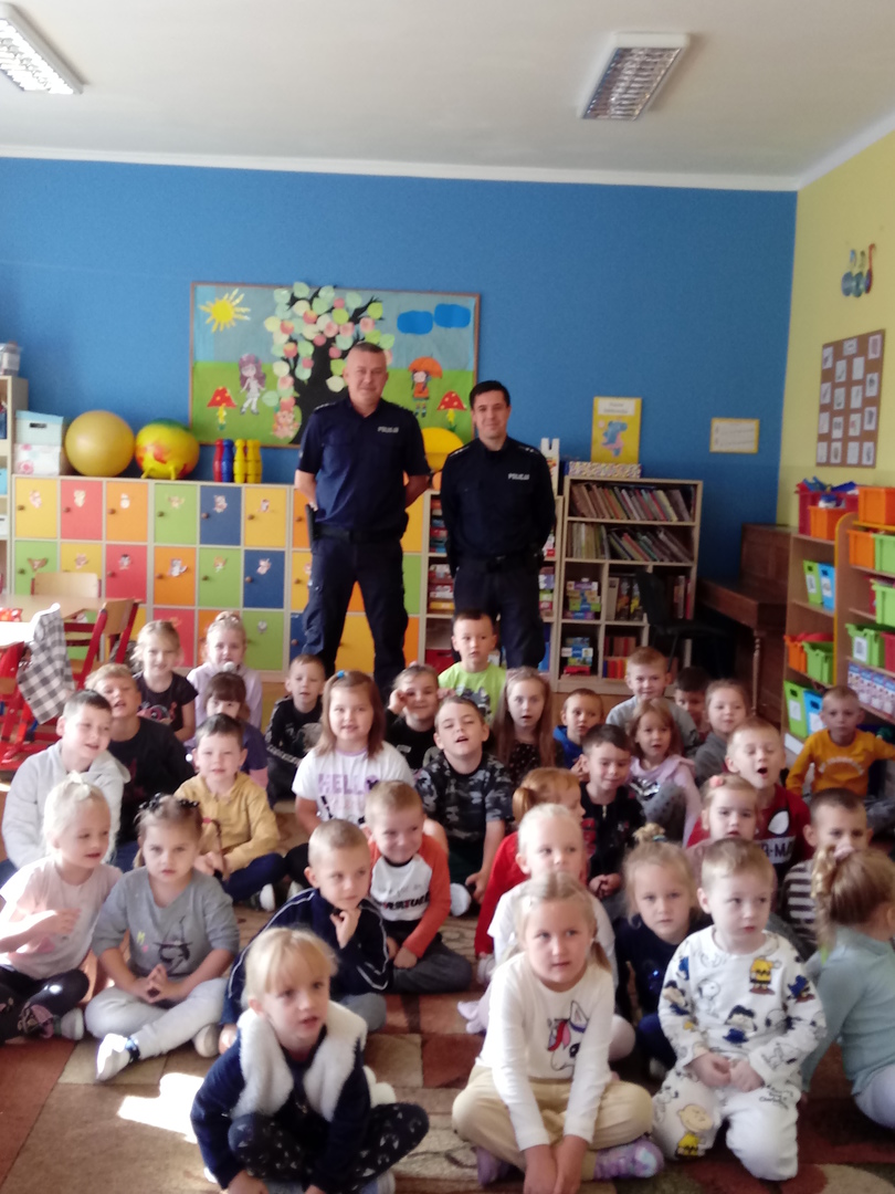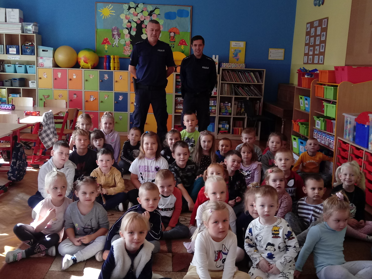 23.09.2022r. odbyło się spotkanie oddziałów przedszkolnych z Policjantami. Nasz dzielnicowy - mł. asp. Leszek Szymczak wraz z kolegą zwrócili uwagę dzieciom, na konieczność przestrzegania podstawowych zasad bezpieczeństwa podczas jazdy samochodem do szkoły, przechodzenia przez jezdnię, spotkania z nieznajomym dorosłym bądź kpntaktu z nieznanym pieskiem. Uczniowie aktywnie uczestniczyli w spotkaniu, chętnie dzieląc się swoimi wiadomościami i umiejętnościami.