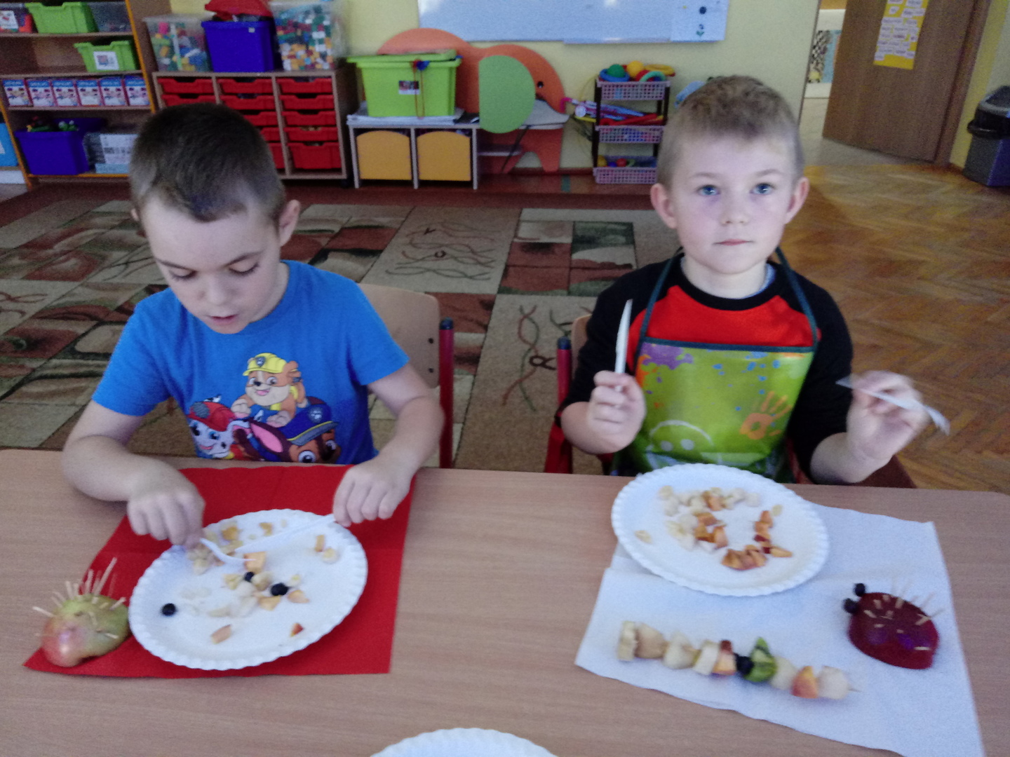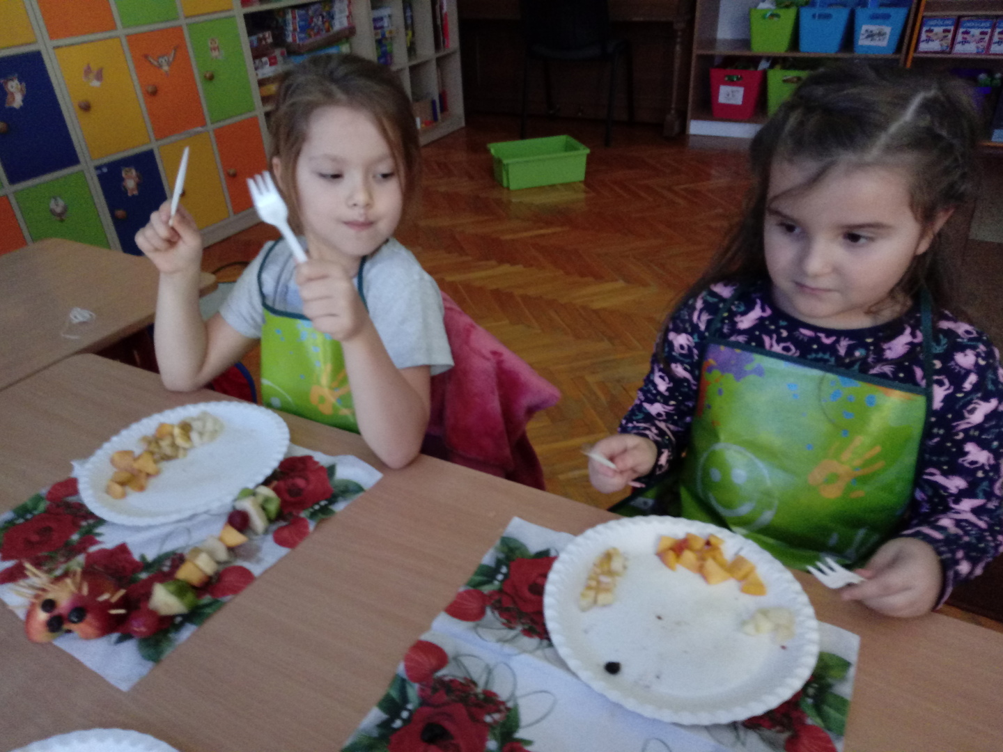 - "Savoir vivre przy stole” zadanie z modułu III punkt 15 przygotowały sałatkę owocową oraz omówiły zasady prawidłowego zachowania przy stole i posługiwania się sztućcami.