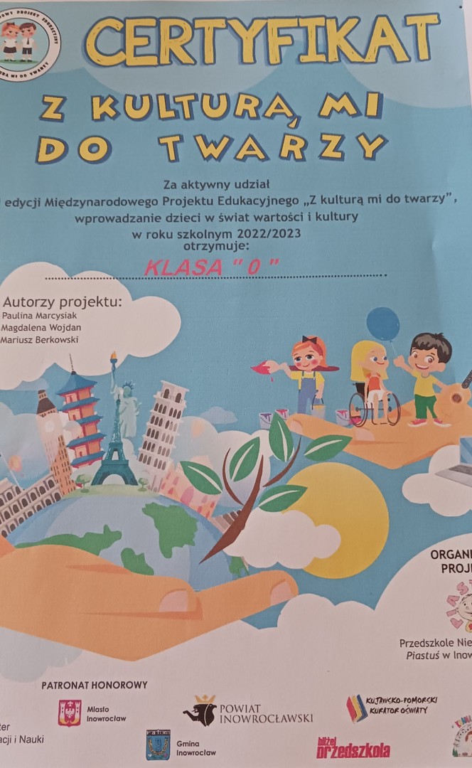 Dzieci z klasy „0” zakończyły realizację międzynarodowego projektu „Z kulturą mi do twarzy”. W ramach projektu zostało wykonanych 21 zadań o różnorodnej tematyce z czterech modułów.