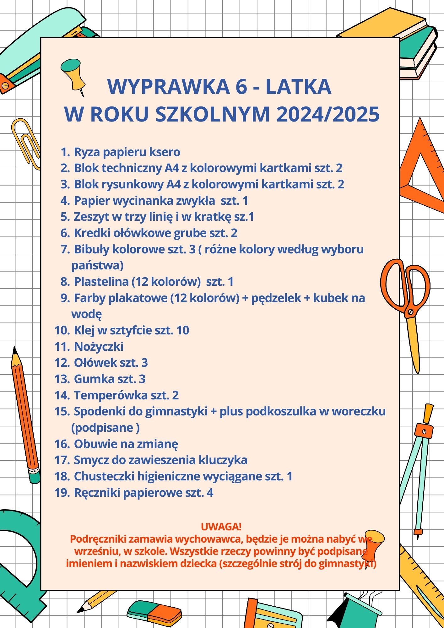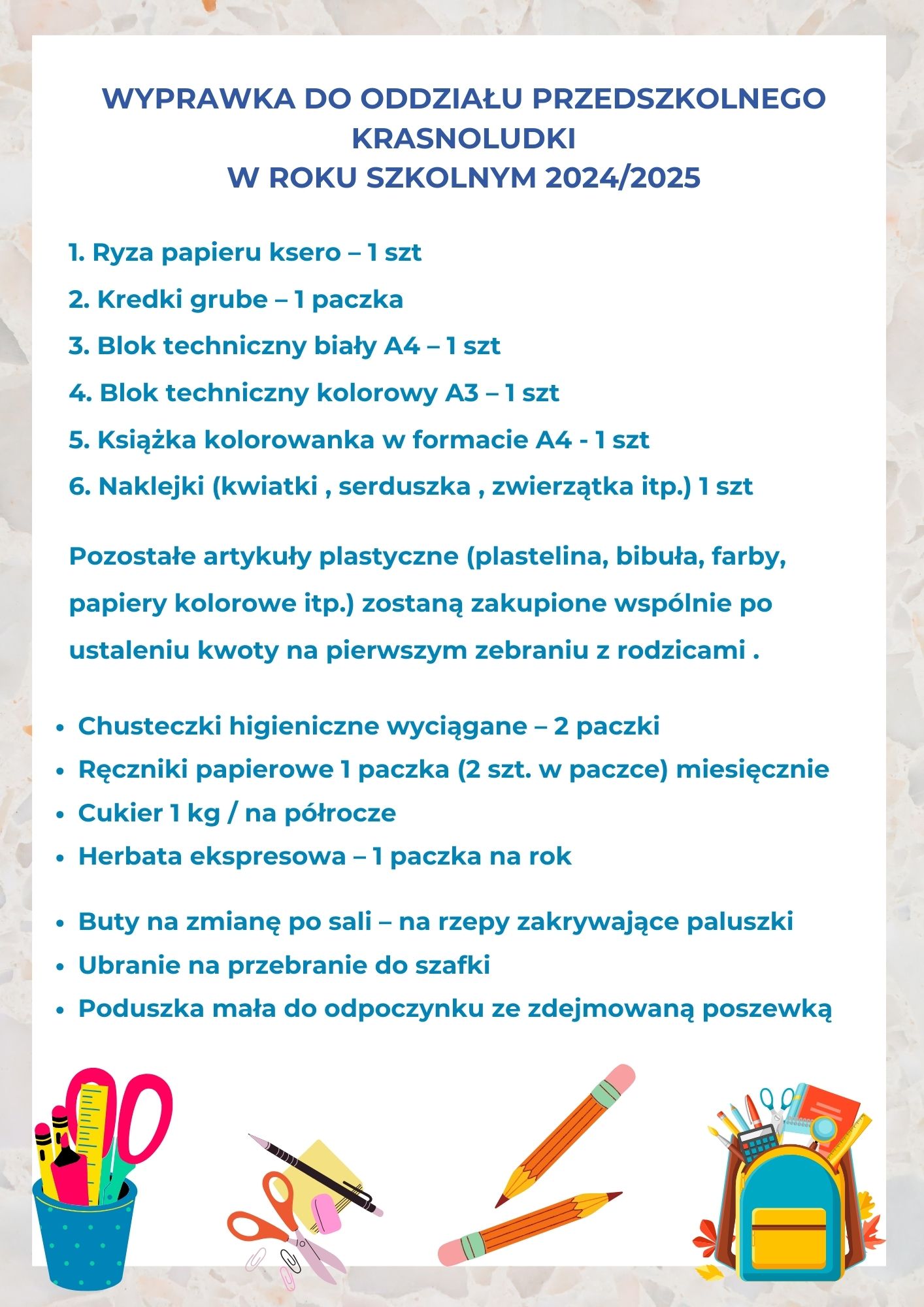 Zaczynamy przygotowania do nowego roku szkolnego. Rodziców dzieci z oddziałów przedszkolnych - Krasnoludki i klasa "0" prosimy o zapoznanie się z listą potrzebnych przyborów.