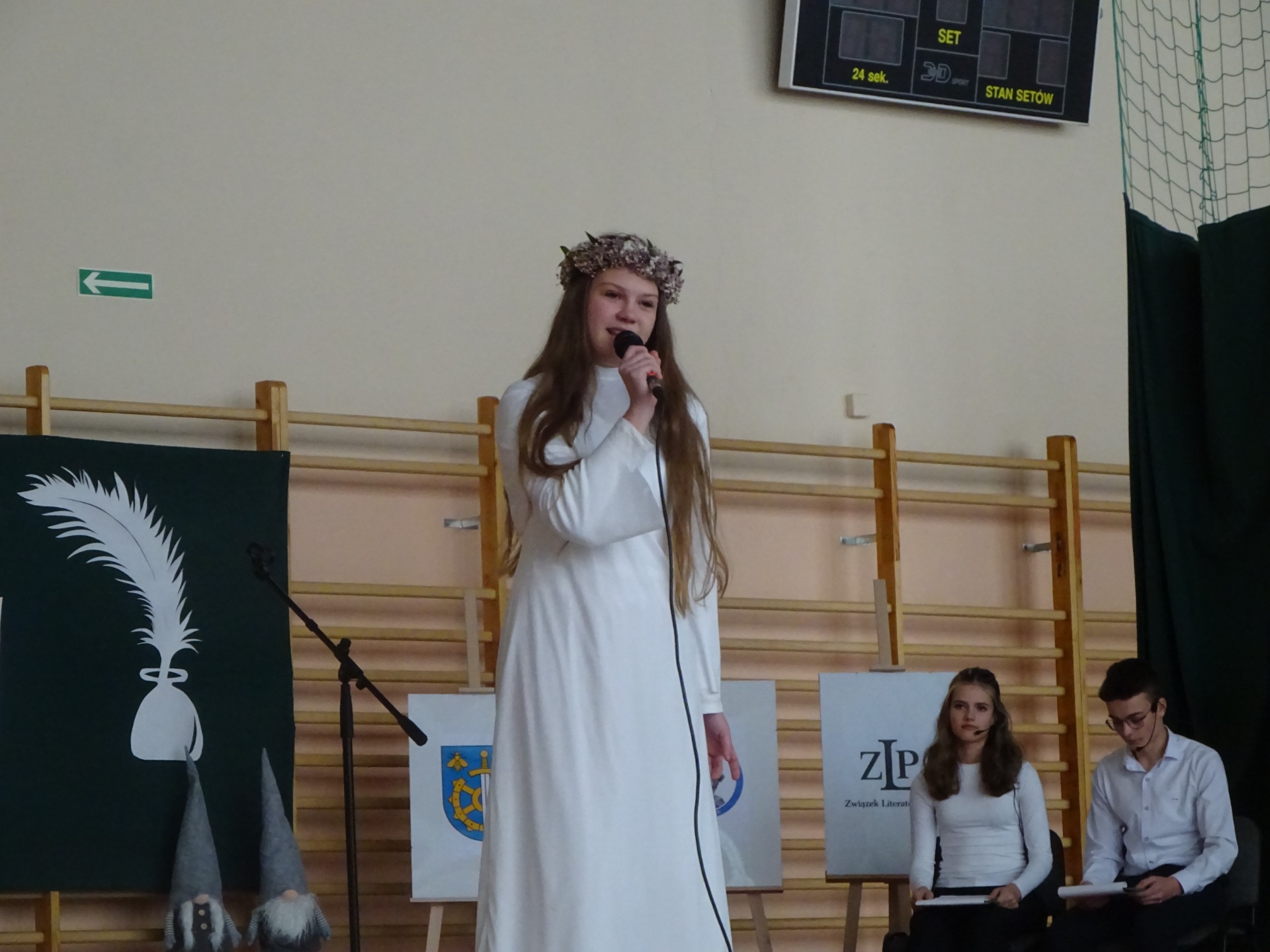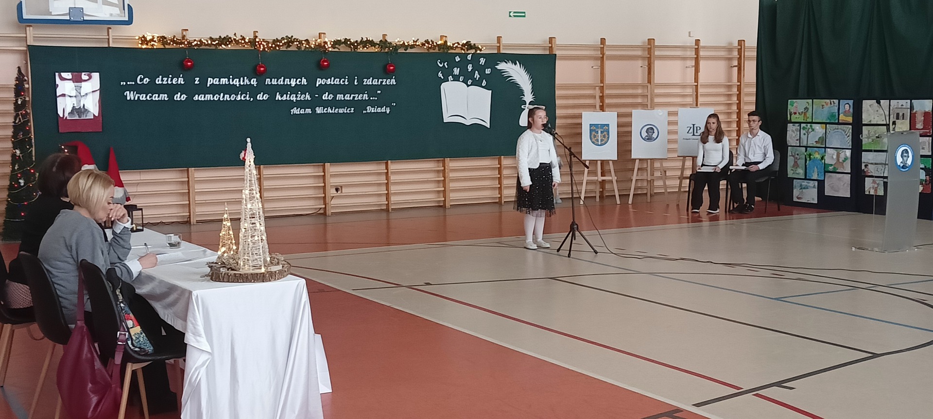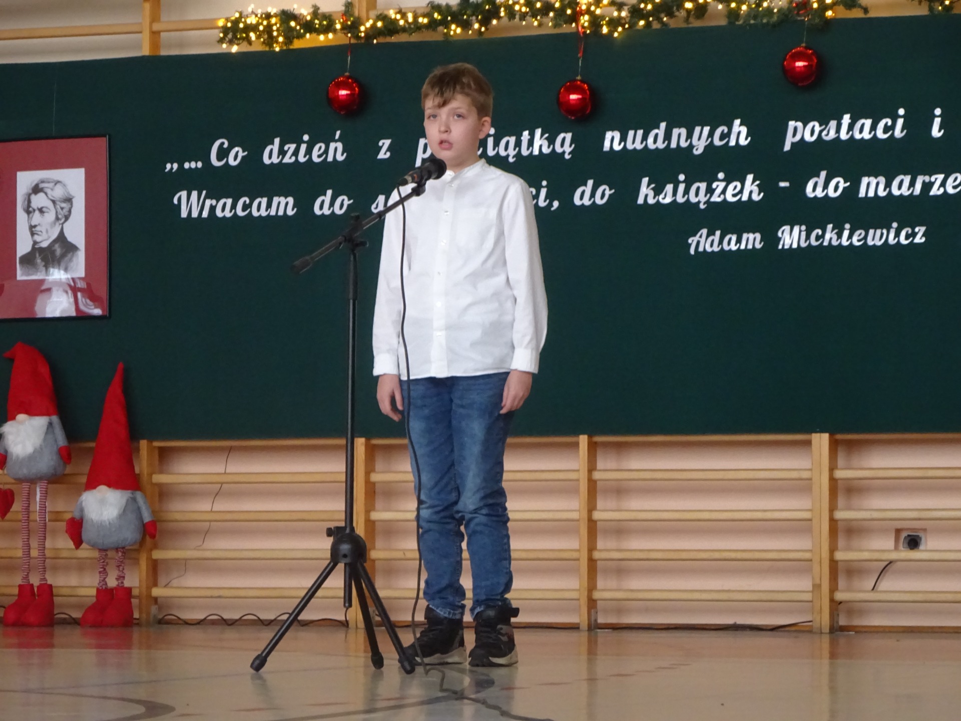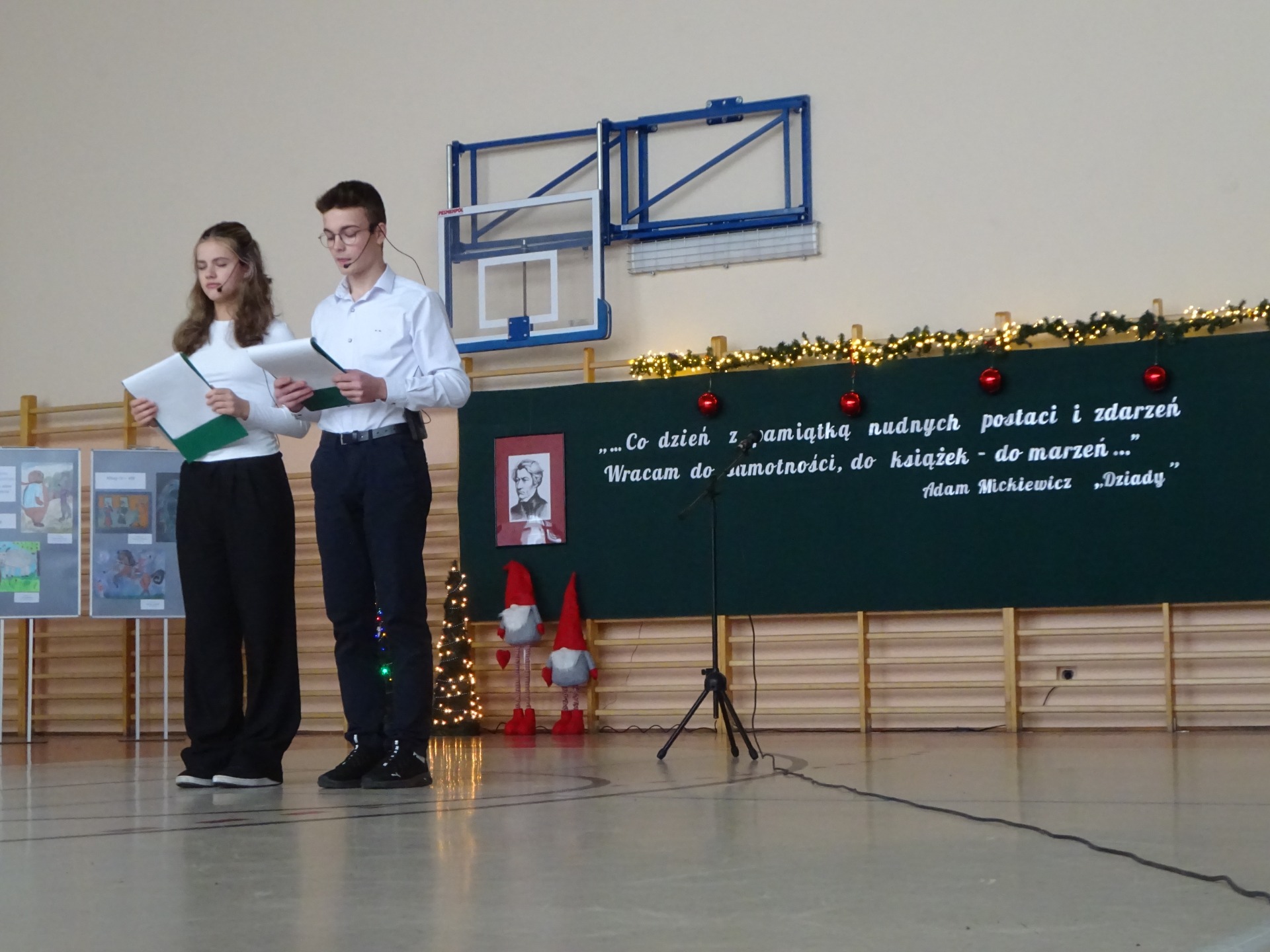 12 grudnia 2024 r. w Szkole Podstawowej im. Adama Mickiewicza w Wojsławicach odbył się Gminny konkurs recytatorski „Śladami słów Adama Mickiewicza” oraz konkurs plastyczny „Malarska wizja utworów Adama Mickiewicza” pod patronatem pana Henryka Staniuchy – Wójta Gminy Zduńska Wola oraz Związku Literatów Polskich w Warszawie. Uczestnicy konkursu wyrazili swoje interpretacje twórczości poety poprzez zarówno recytację jego wierszy, jak i twórcze prace plastyczne. To wyjątkowe połączenie słowa i sztuki pozwoliło na głębsze oddanie hołdu patronowi naszej szkoły. Uczniowie wzruszająco recytowali wiersze mistrza romantyzmu, ukazując głęboką kulturę i piękno polskiego słowa.