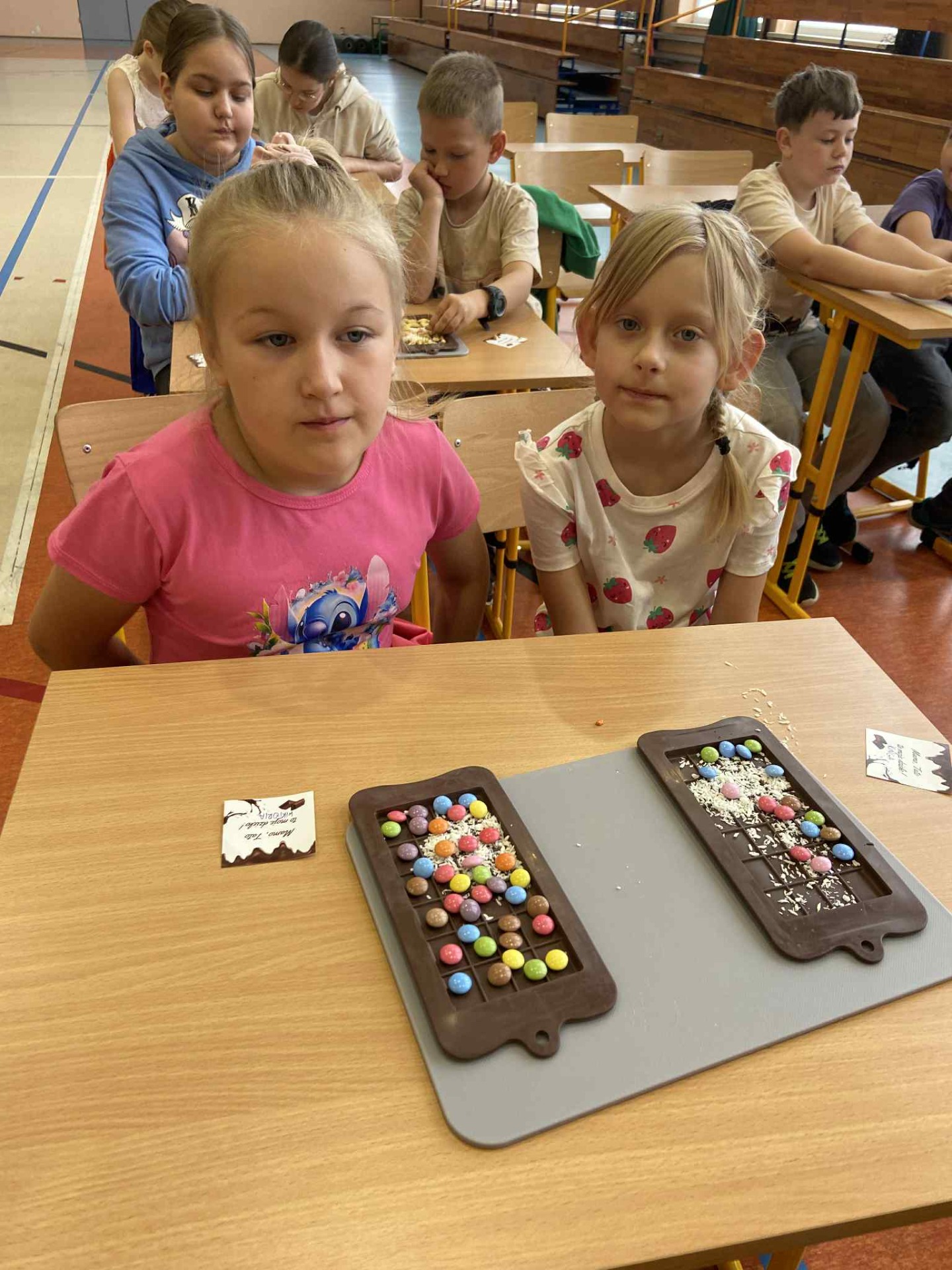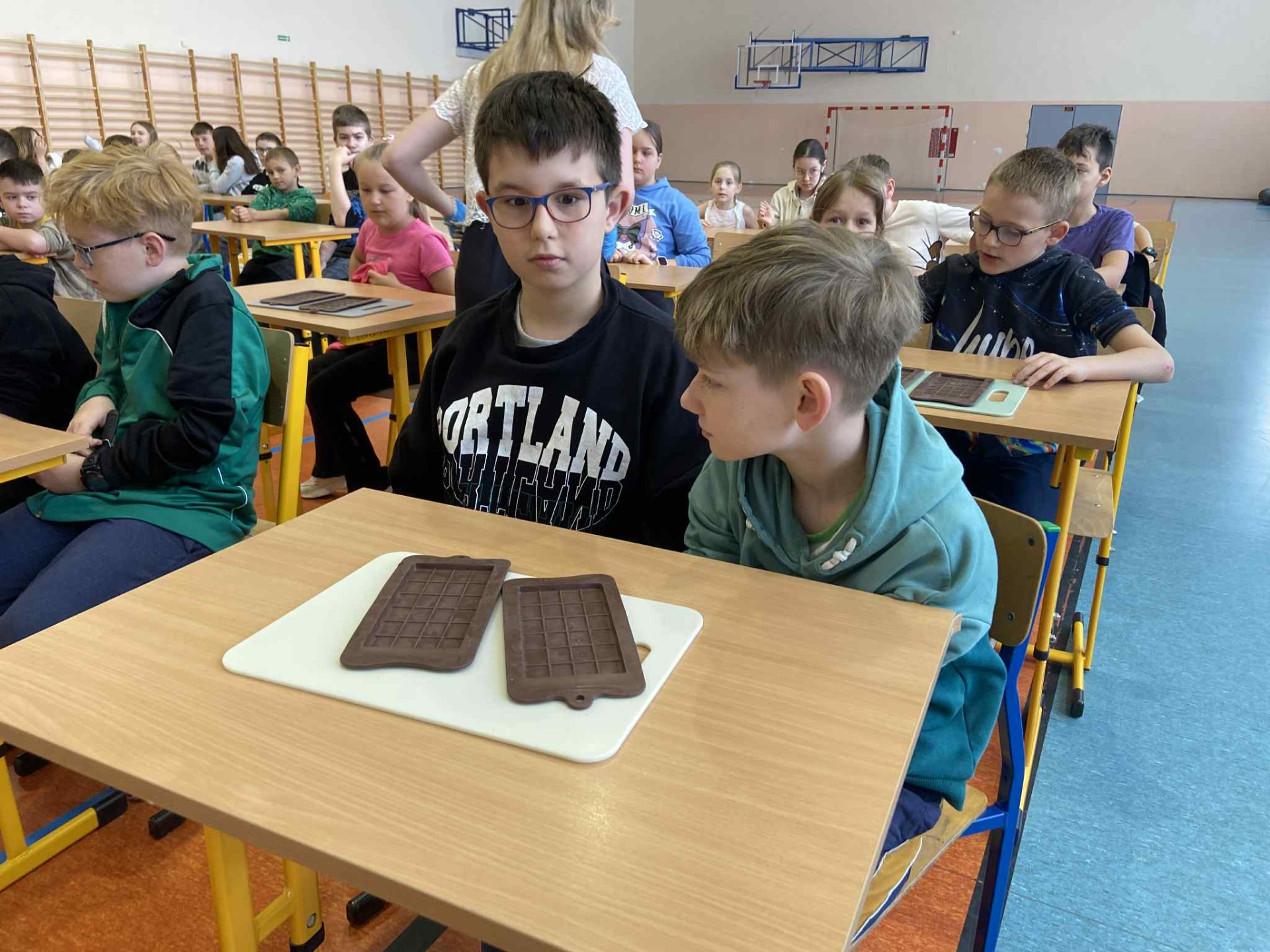 W dniu 30 maja w naszej szkole odbyły się warsztaty robienia czekolady, które sprawiły uczniom wiele radości. Dzieci poznały historię czekolady, dowiedziały się, skąd pochodzi kakao i jak powstaje tabliczka czekolady oraz jaki ma wpływ na naszą pamięć i zdrowie. Następnie każdy uczestnik mógł własnoręcznie przygotować swoją słodką kompozycję, dodając ulubione dodatki, takie jak bakalie czy kolorowe posypki.