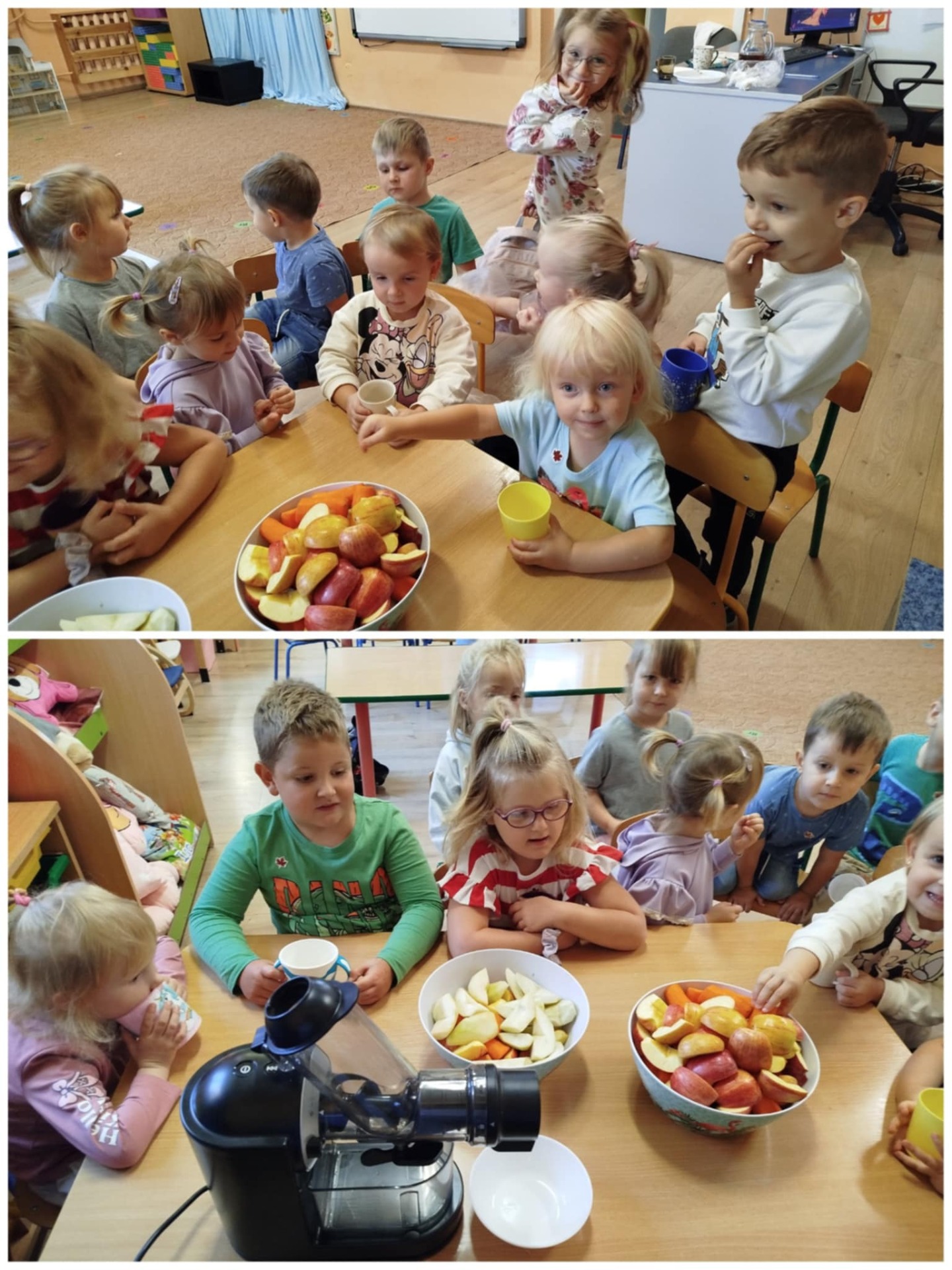 Dziś w naszej grupie odbyły się pierwsze zajęcia z cyklu "kuchnikowo" – pełne smaków, zapachów i dobrej zabawy! Dzieci miały okazję wspólnie przygotować pyszny i zdrowy sok warzywno-owocowy, w którego skład weszły jabłka, gruszki oraz marchewki.