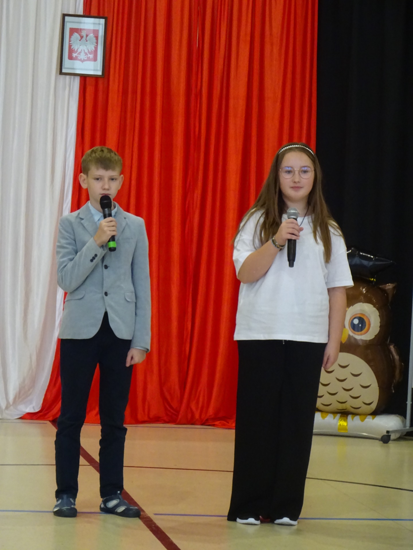 Z okazji Dnia Edukacji Narodowej starsi uczniowie przygotowali krótkie przedstawienie, w którym z humorem i serdecznością podziękowali nauczycielom za trud, cierpliwość i codzienną troskę. Uroczystość przebiegła w ciepłej, radosnej atmosferze – pełnej gratulacji, życzeń i wzruszeń. To był dzień pełen emocji, uśmiechu i wzajemnej życzliwości.
