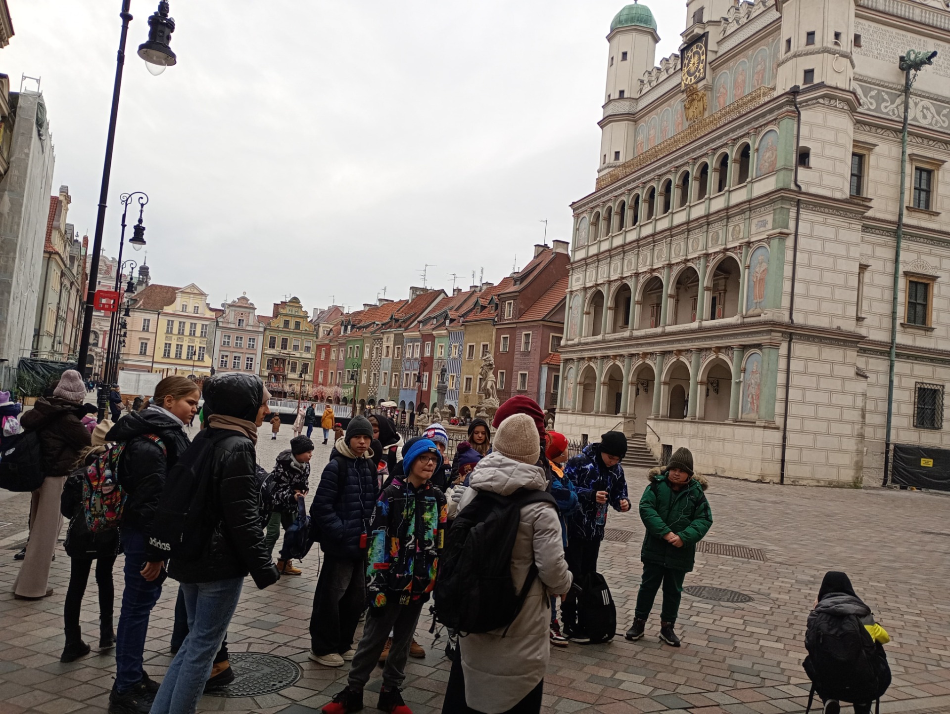 Następnie grupa udała się na Stary Rynek, gdzie miała okazję zobaczyć słynne koziołki poznańskie i podziwiać zabytkowe kamieniczki. Po krótkim spacerze uczestnicy wycieczki zjedli obiad, po czym przemieścili się do Ratusza, gdzie wzięli udział w warsztatach edukacyjnych dotyczących historii i funkcjonowania miasta.